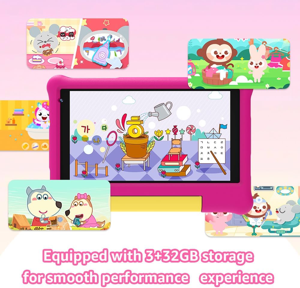 [Quad-core processor and plenty of storage]:This kid’s tablet is powered by a powerful quad-core processor that ensures quick response to commands from little fingers.2+32GB of storage makes it a treasure trove of educational apps, games and kid-friendly content.