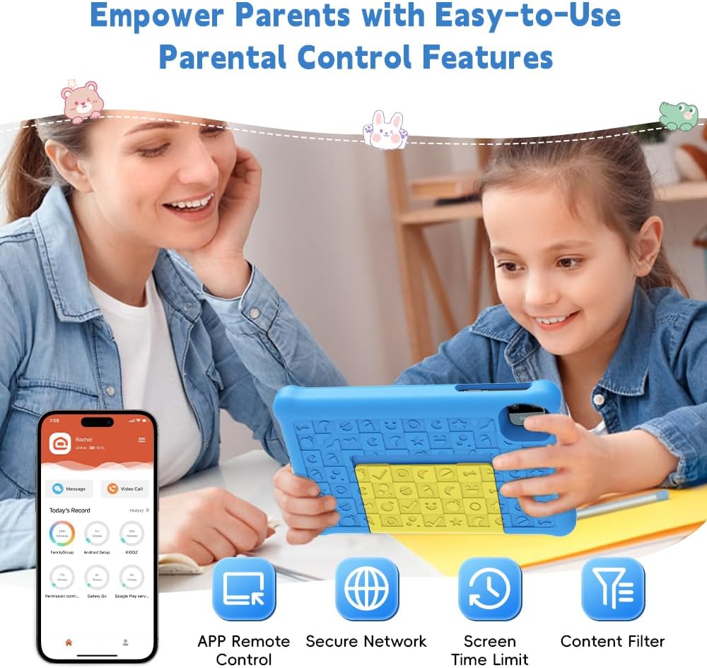 【Parental Control Mode】Parents can set up multiple kids’ accounts, monitor their children’s browsing time and select kid-friendly content , set screen time limits, and lock their kids tablets