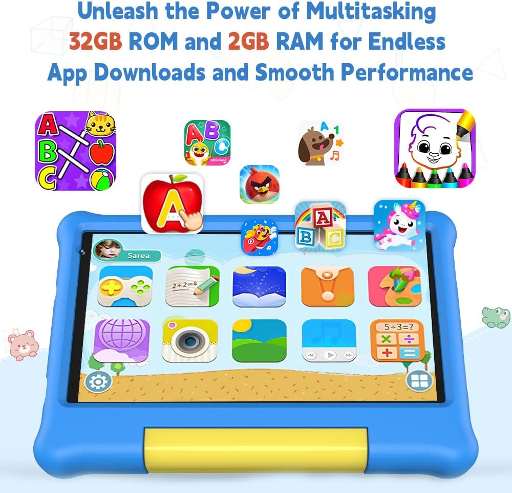 ApoloMedia 7-inch Kids Tablet, Quad Core Android 13 Tablet for Kids, 7inch HD Display, 2+32GB, Dual Camera, Educational games, Parental Control Mode, Kids Software Pre-Installed. Specifically for children, this tablet offers a safe and fun environment. It comes preloaded with educational learning software and Google Kids Space, offering a wide range of entertainment and educational content while ensuring their online safety.