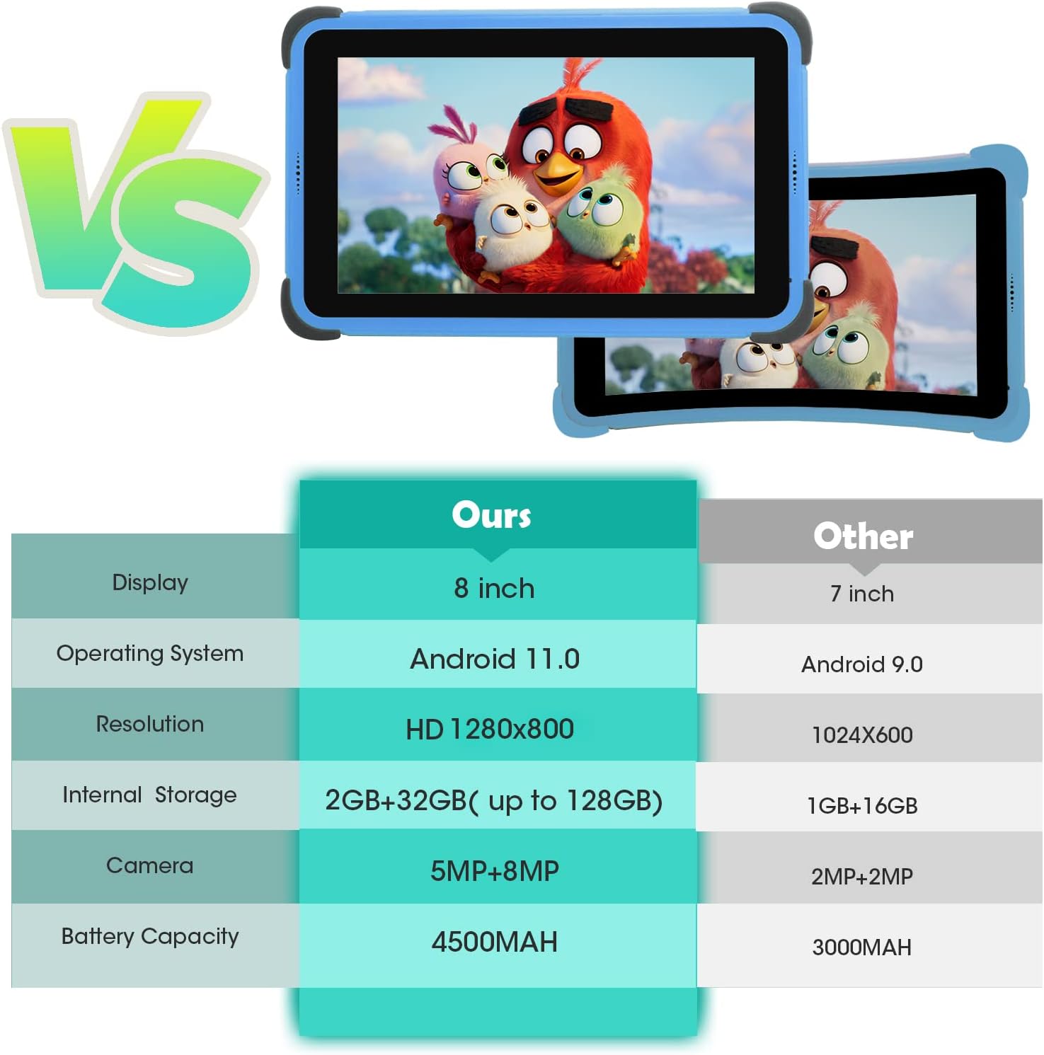 ✔ 【HD Display with Eyes Protection】This children’s tablet for toddlers adopts a 8” 1280 x 800 IPS HD touchscreen. It can automatically adjust the brightness to a comfortable reading experience. That provides an outstanding visual experience. The 4500mAh large capacity battery allow you to enjoy up to 8 hours of mixed reading, lisenting, watching video and game playing.