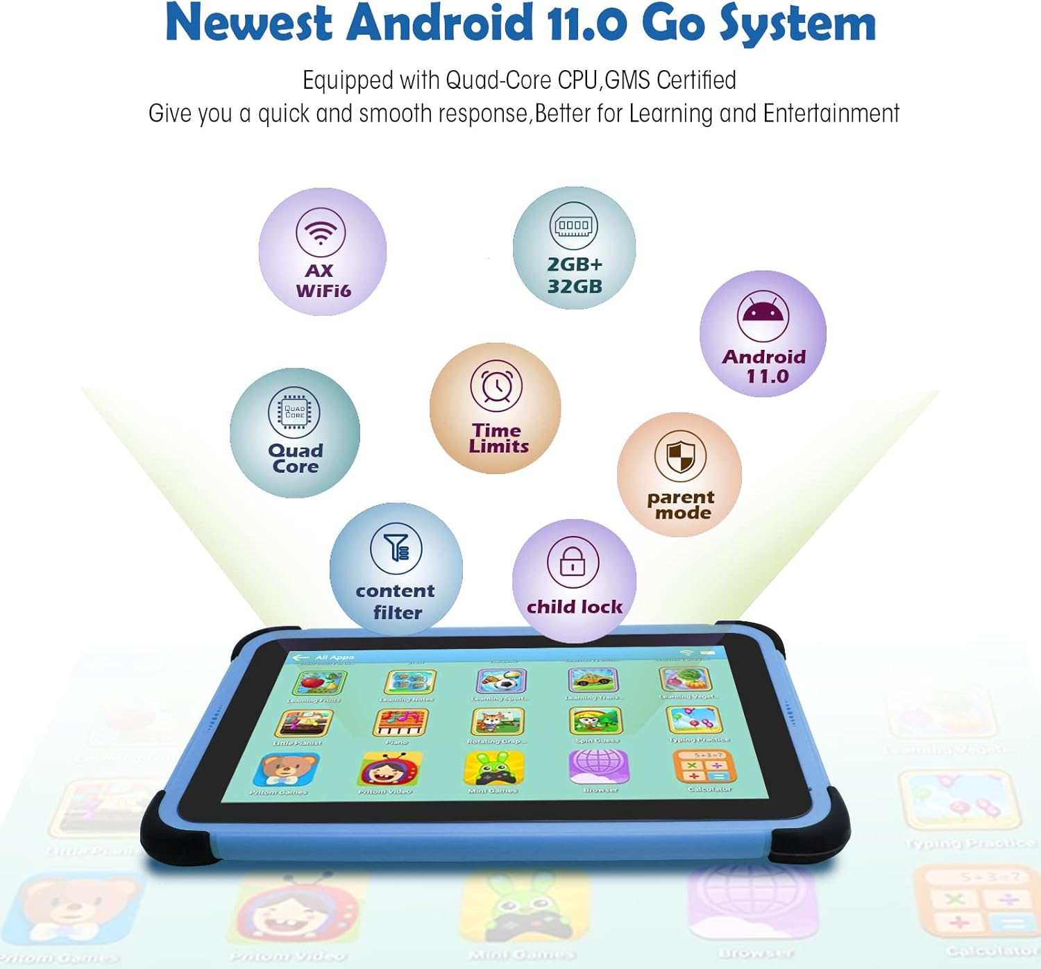8 inch Kids Tablet Android Tablets for Kids,AX Wifi 6,1280×800 IPS HD Display,2GB RAM 32GB ROM TF 256GB Toddlers Tablet with Parental Control,5+8MP Camera,WiFi,with Kids-Tablet Case and Stand (Blue)