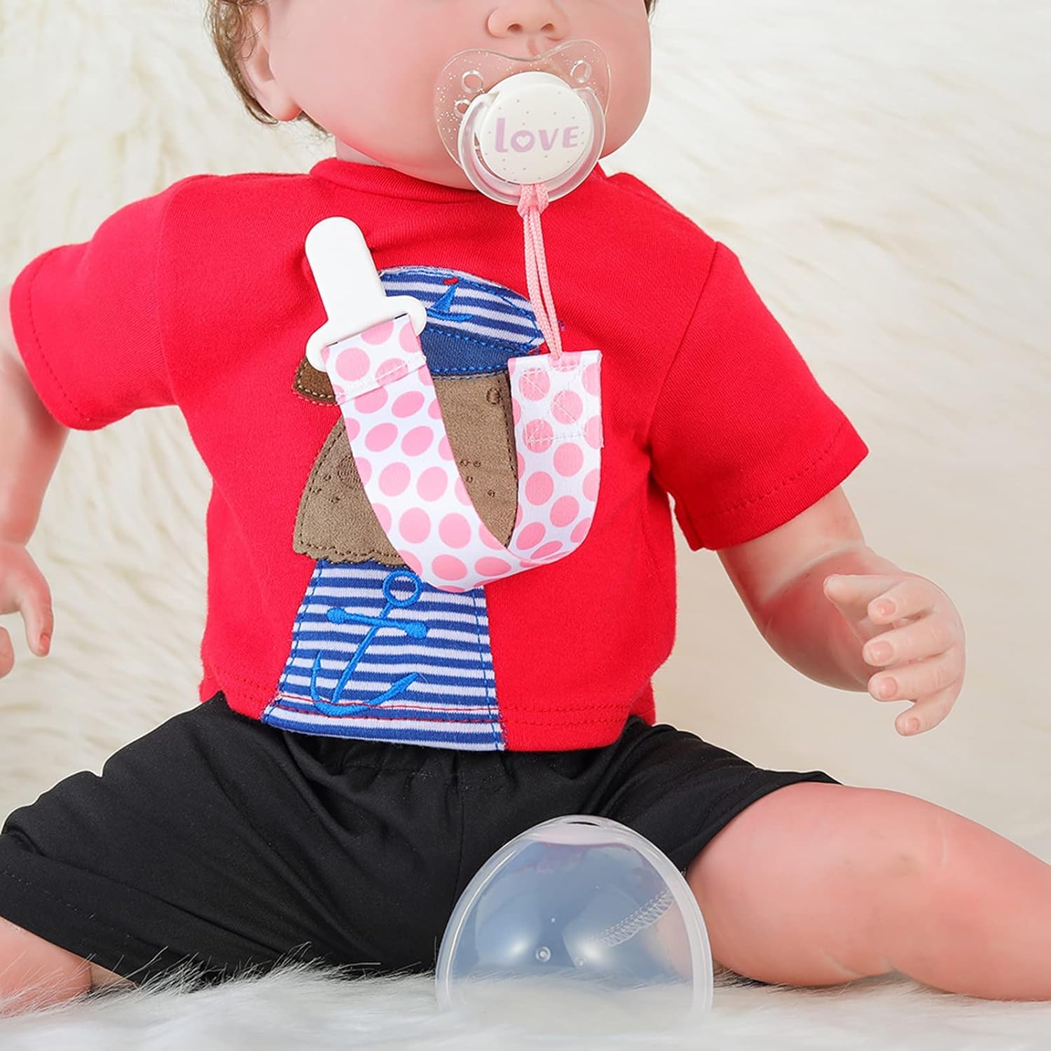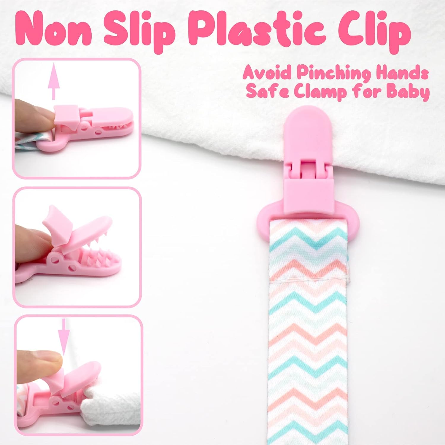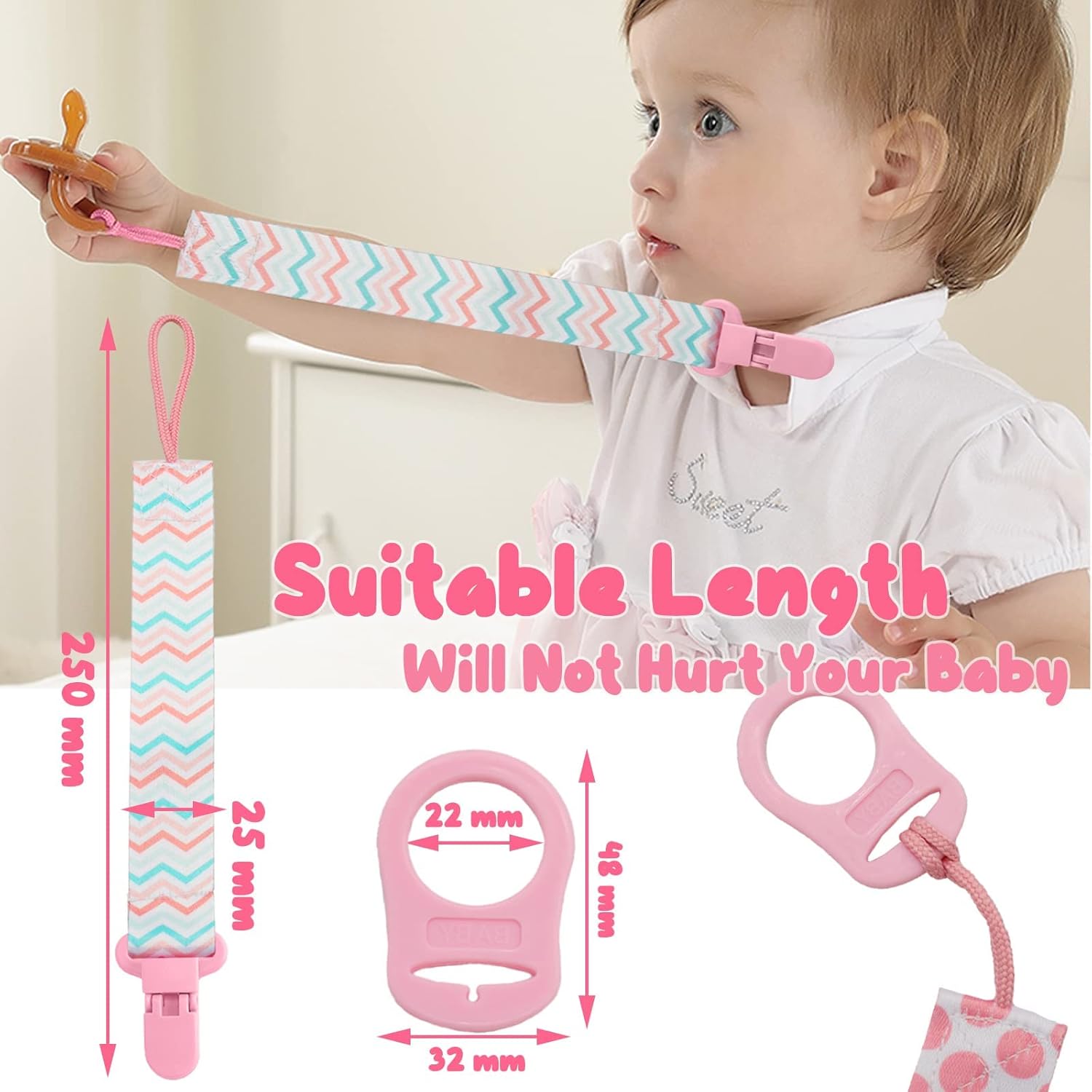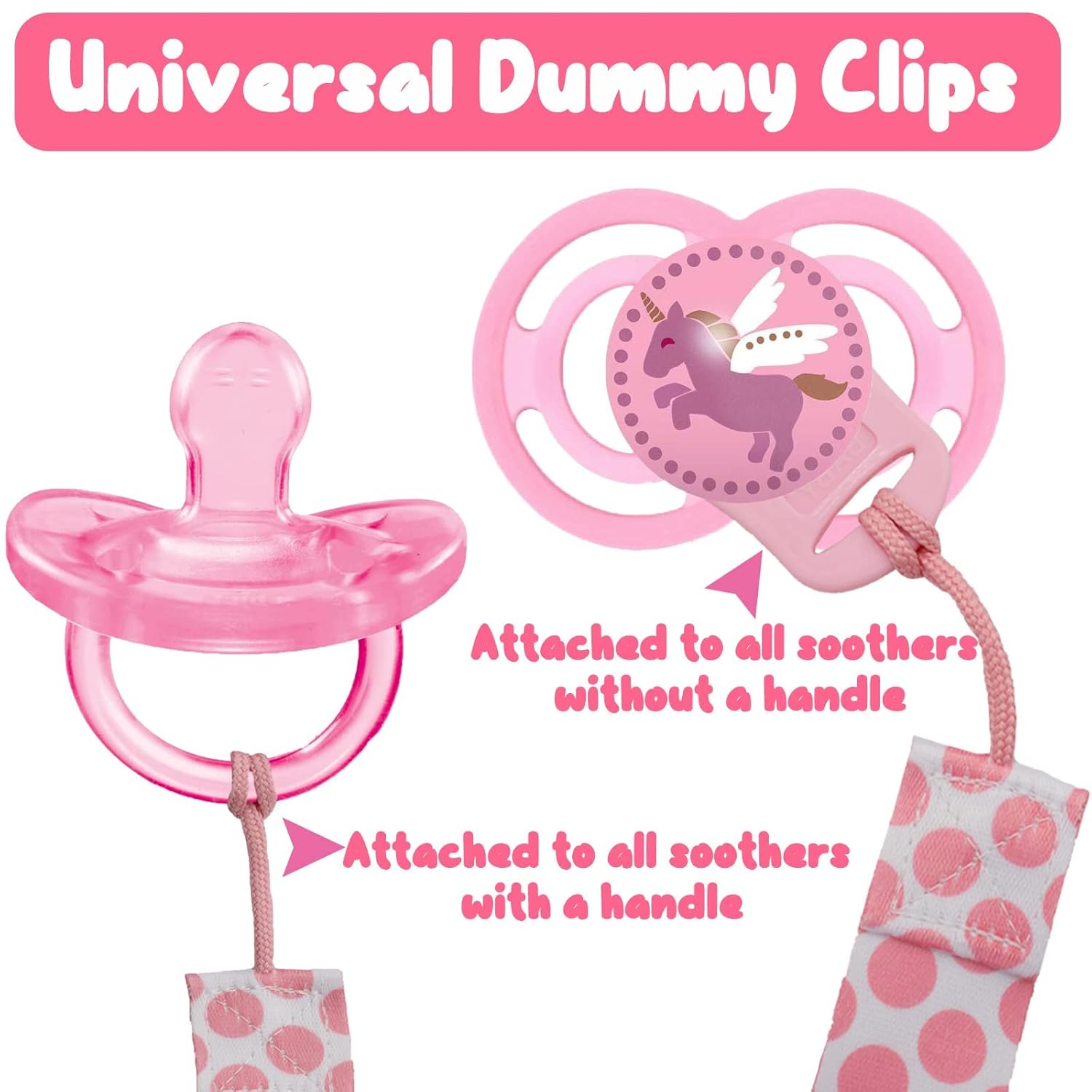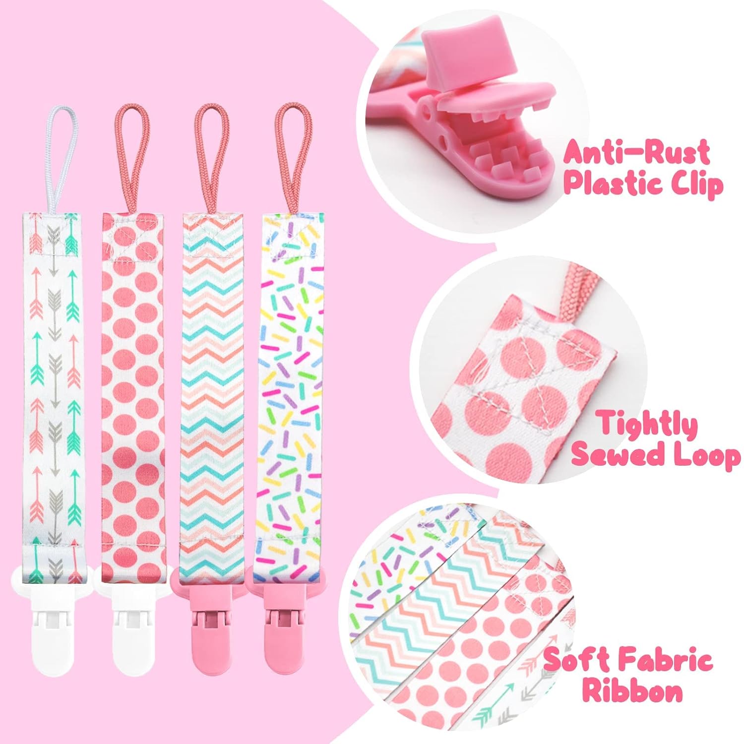 DUMMY CLIPS FOR GIRLS: The dummy holder clips have 4 different double-side printed patterns, pink dots, stripes, arrows, cake, beautiful colors and styles suitable for baby girls of all ages of newborns, infants, toddlers. Each size is 26 x 2.5 cm.