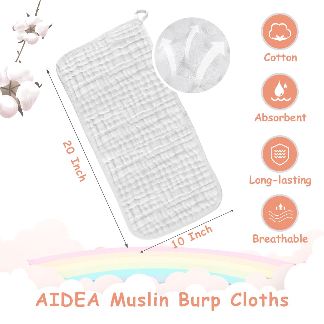 AIDEA Burp Cloths-20 x10, Muslin Burp Cloths for Babies, Highly Absorbent Cotton Burp Cloths, Large Soft Breathable Baby Rags for Boys and Girls, Newborn Essentials, Baby Gifts, White-10 Pack