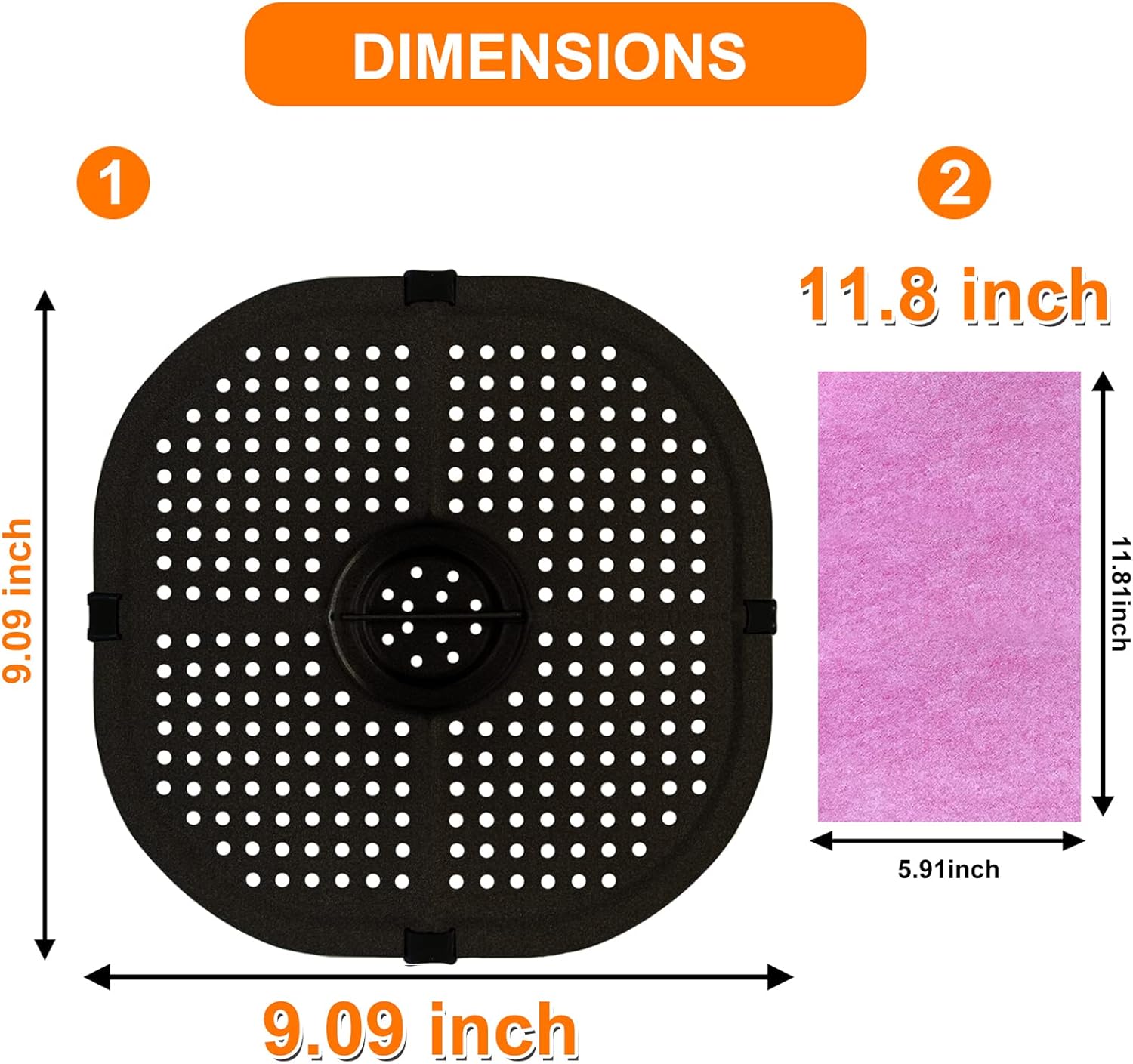 【Warm Tips】: 🔔 1, It must be installed in an air fryer basket which with a protruding part on the edge. 2, Please measure your air fryer basket before order to make sure this 9.65* 9.45 IN crisper plate is usable. 3, Please do not rub with the rough abrasive cloth or metal balls in case of damaging the anti-stick coating. Therefore We have prepared a magic cleaning cloth!