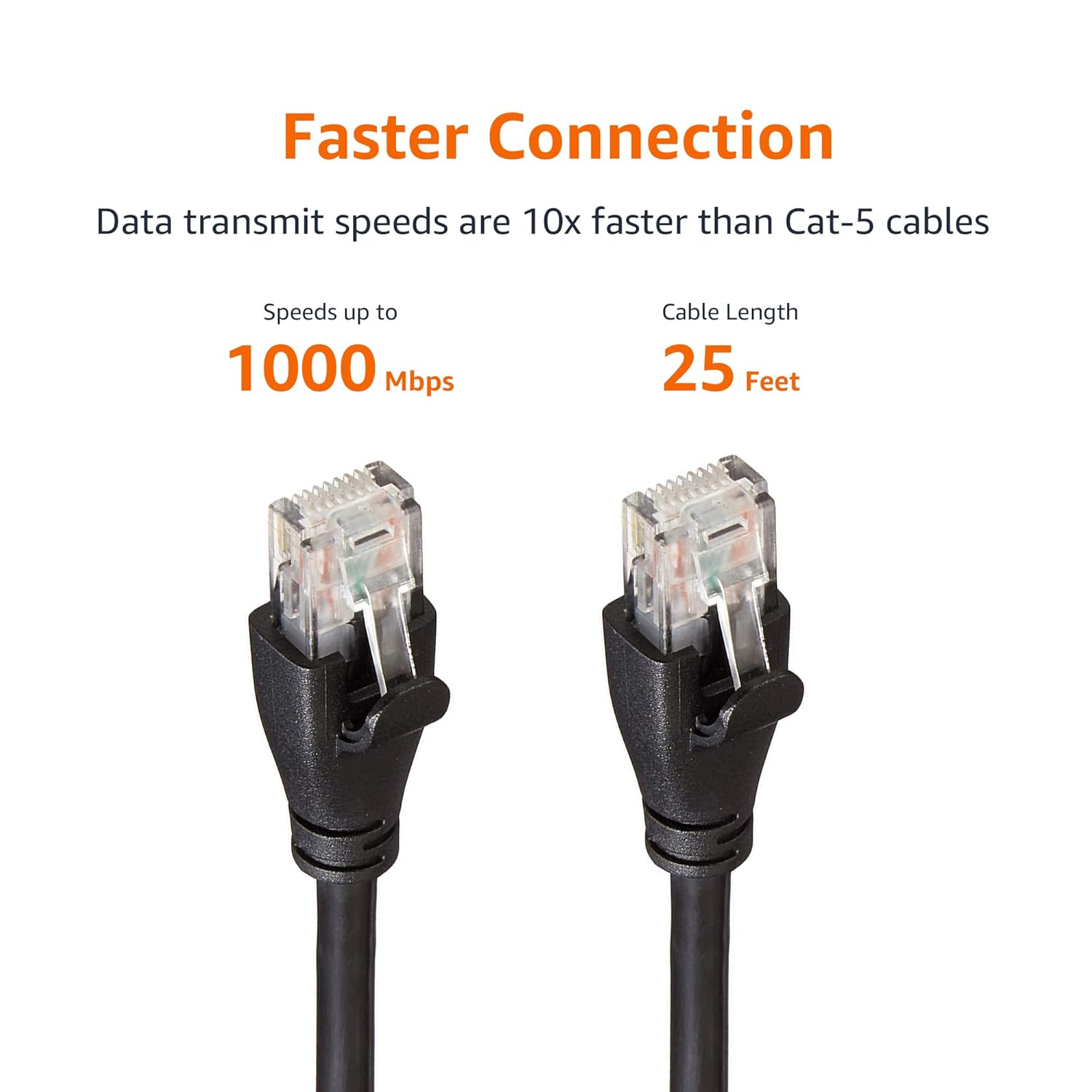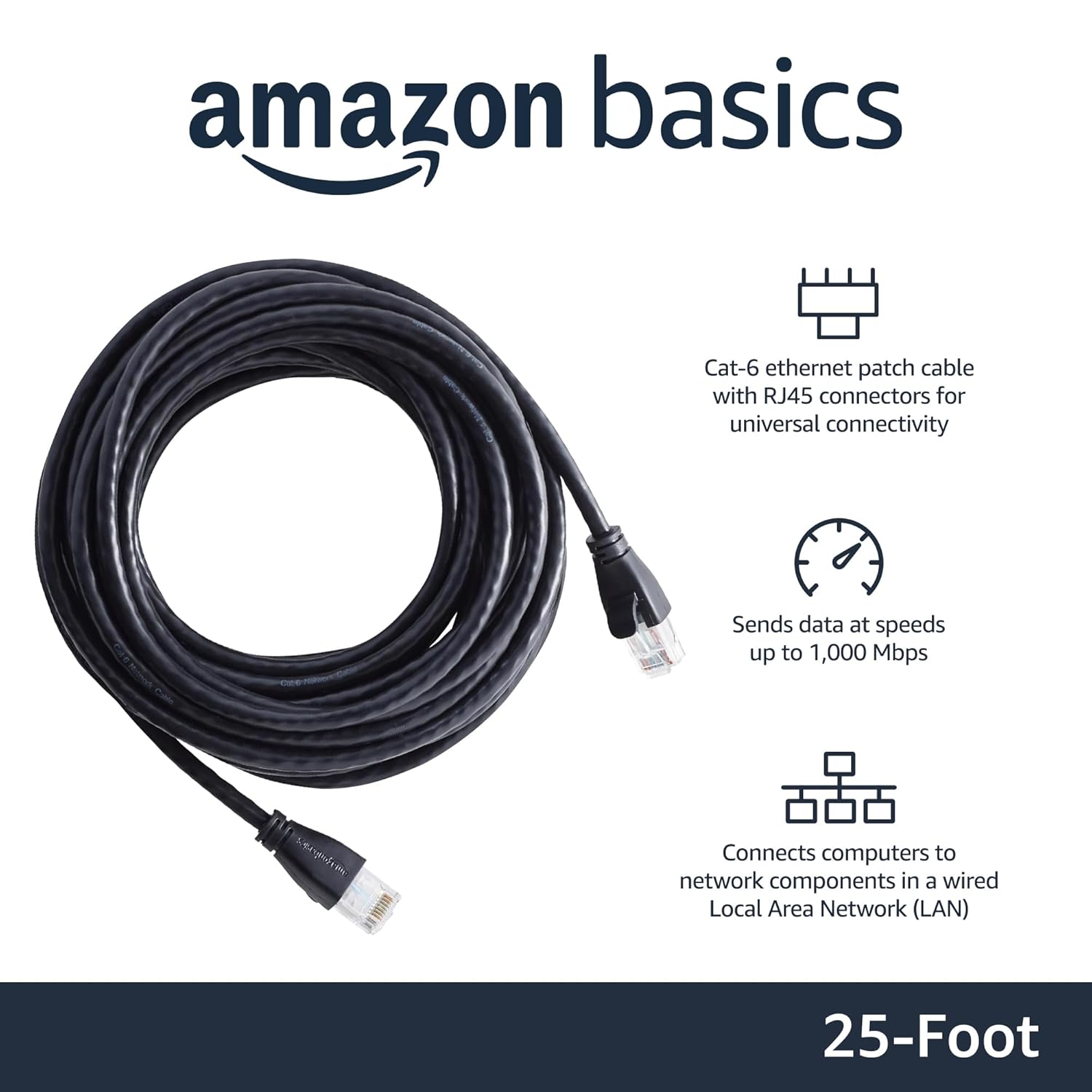 Amazon Basics RJ45 Cat-6 Ethernet Patch Cable, 1Gpbs Transfer Speed, Gold-Plated Connectors, 25 Foot (7.6 Meters), Black