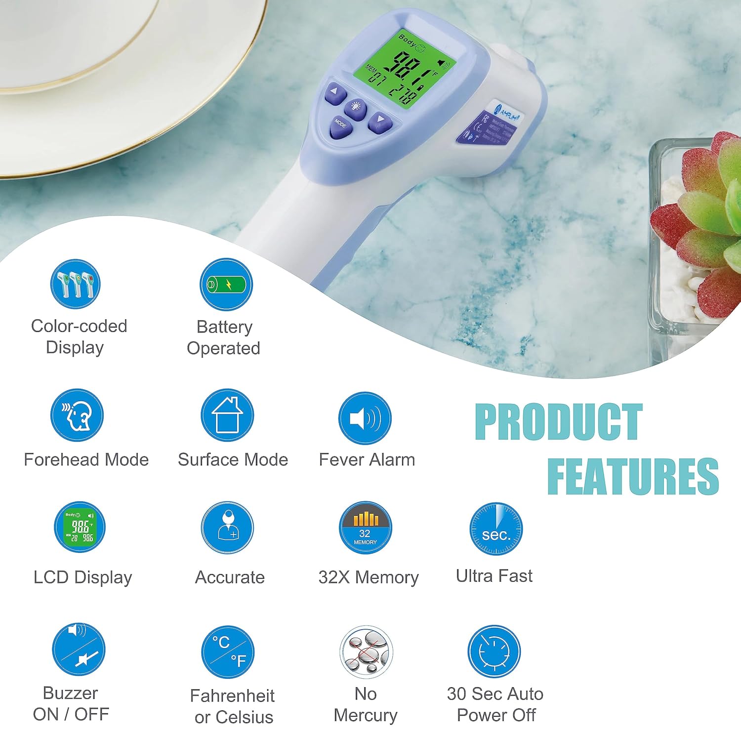 Dual-mode Celsius or Fahrenheit (C / F) Color-coded Display Mute Function 32 memories Fever Alarm Auto Power Off Forehead Mode Surface / Object Mode