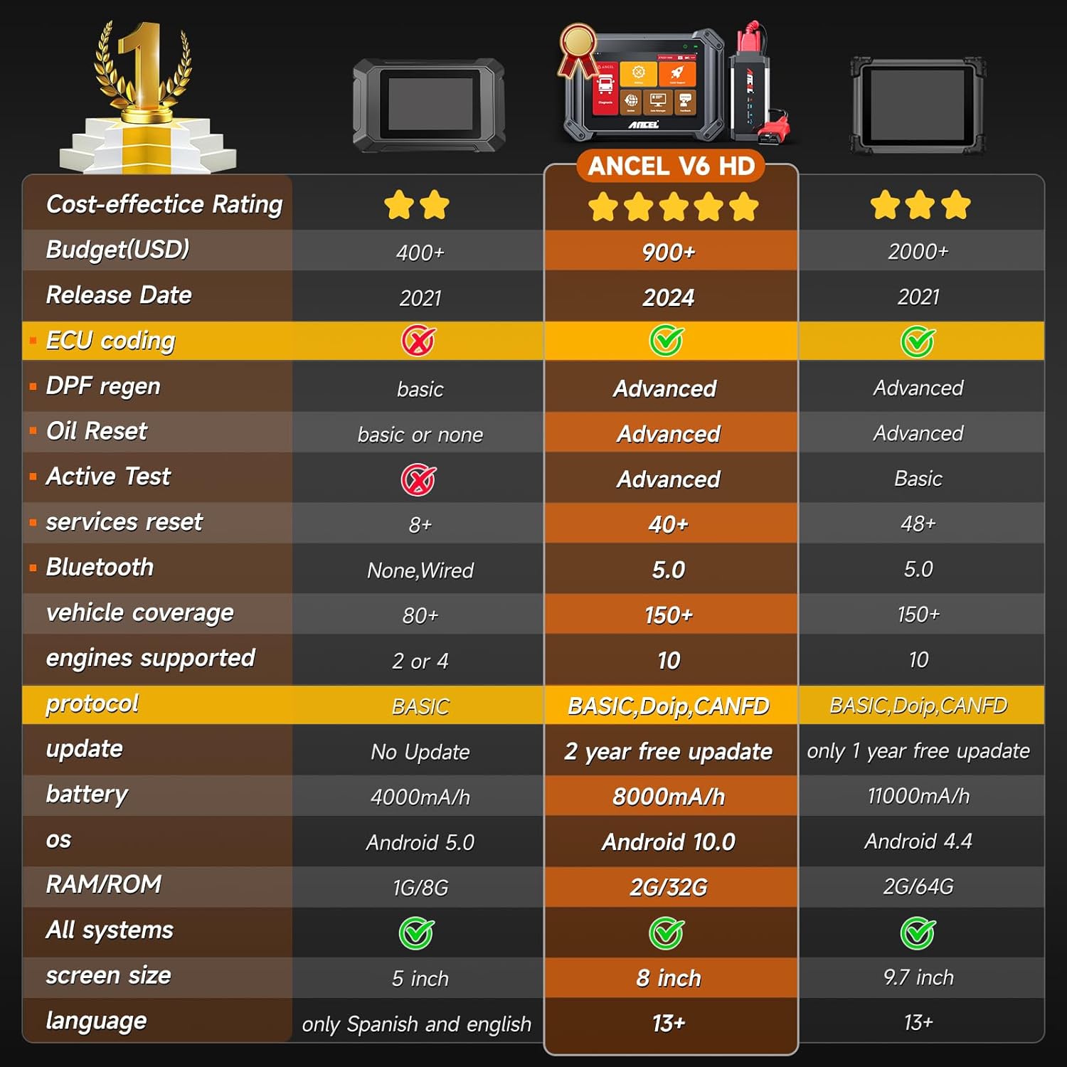 🔥🔥🔥【2024 ANCEL V6HD, TOP-NOTCH HEAVY DUTY TRUCK SCANNER】ANCEL V6HD is designed to diagnose 12-24V diesel trucks/ buses/ trailer/ commercial vehicles,V6HD diesel scanner offers more than 10 advantages: ✅ Advanced Bidirectional Control ✅ ECU Coding&Programming ✅ 3000+ Active Tests ✅ 40+ Service Resets ✅ Full OBD2 Function ✅ All System Diagnostic ✅ Graphing Live Data ✅ 10,000+ Car&150+Brand Coverage✅ CAN FD & DoIP✅ Wireless Operation✅ Data Print/Feedback/Report/Email ✅ 2-YEAR Free Update. 🔥Hardware of V6HD is equally cutting-edge:✅ 8000 mAh✅ 8-Inch Tablet✅ 4-core 2.0Ghz(quicker operation)✅ 2G RAM/32G ROM (Expandable)✅ Android 10.0✅ Bluetooth 5.0 & Wifi✅ 13+ Languages Etc