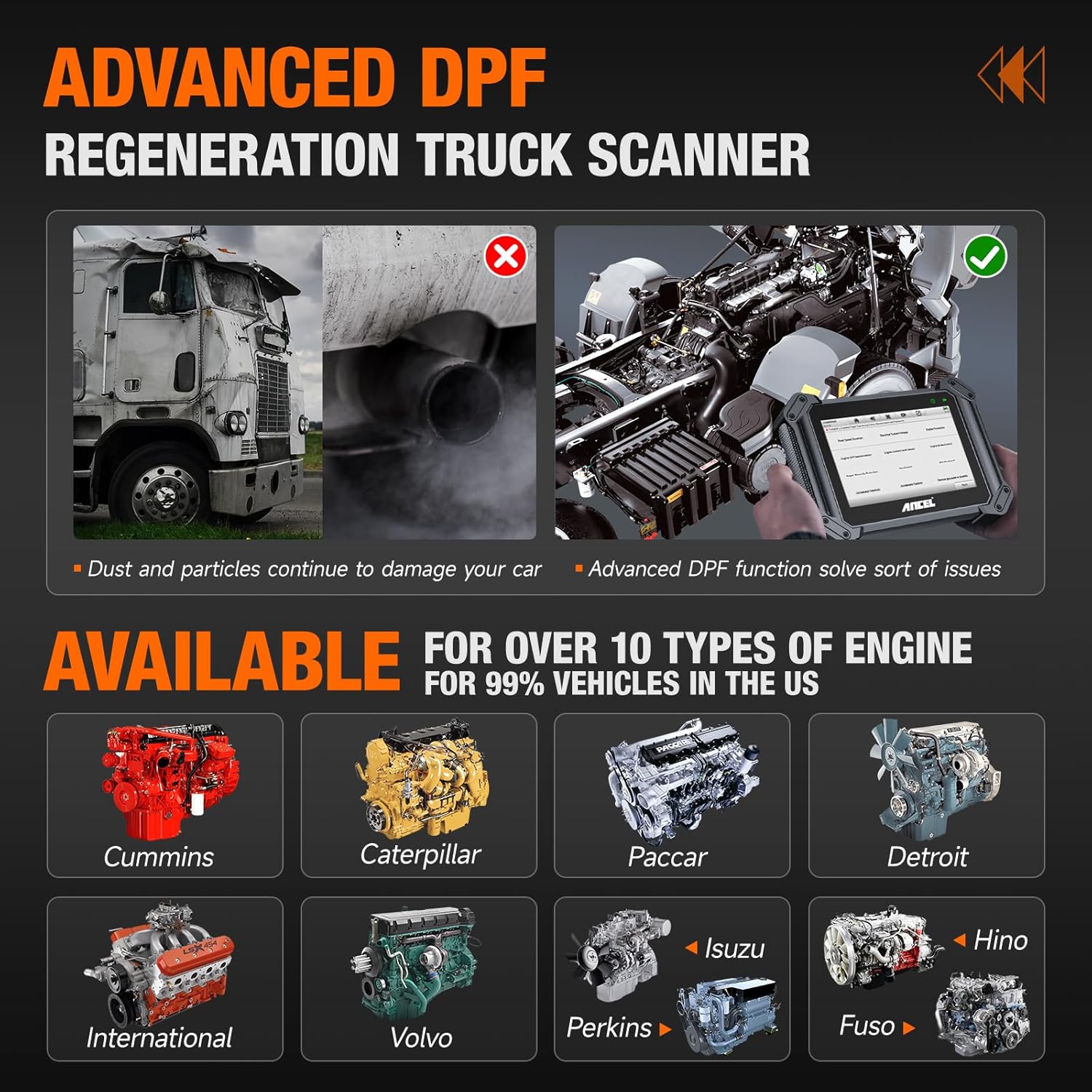 🚛【OEM-LEVEL DPF FUNCTIONS, IN-DEPTH SAVING BUDGET ON FIXING&REPAIRING】V6HD support OEM-level dpf function for Cummins, Detroit, Caterpillar, Paccar, International, Volvo engine etc, including dpf regen, dpf related information reset, dpr state reset, dpd forced regen , dpf pressure sensor learn/reset, dpf/catalyst 2 reset etc,saving the cost of purchasing a dpf, which helps you better solve the exhaust aftertreatment system problems📢NOTE : advanced dpf functions are not compatible with all vehicles, please send us your VIN to check vehicle compatibility.