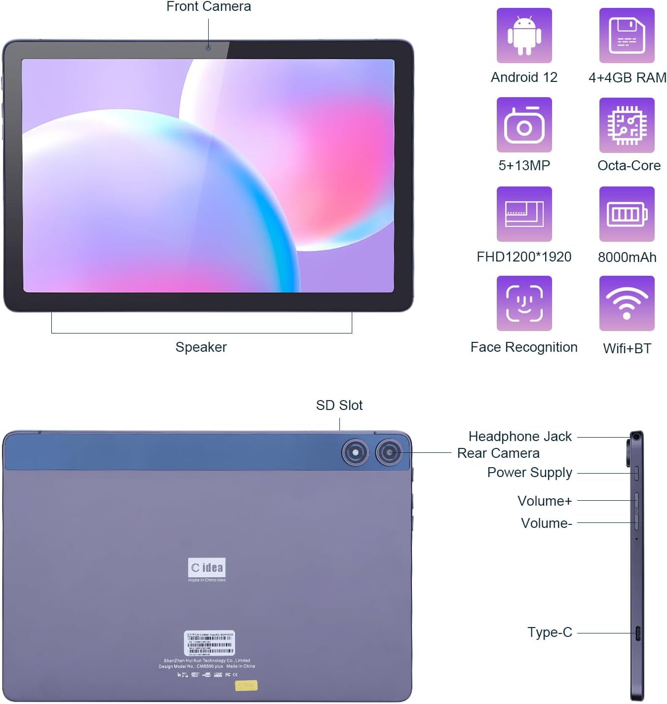 Android 12 Tablet 10 Inches, 2024 FHD 1920 * 1280 Screen Display, 128GB Rom Storage 8GB RAM, Qcta-Core Processor, GPS, WIFI, 6000 mAh Battery Life, Dual Cameras, Adults, Teenagers Gaming