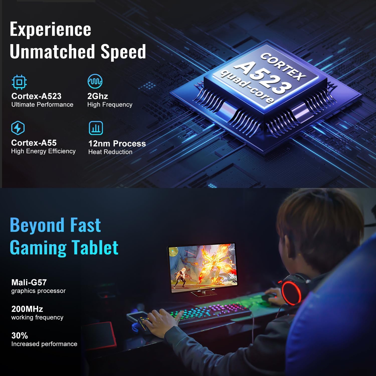 [High-Performance 8-Core CPU Android 12 Tablet] JOJIMOVE tablet is equipped with the excellent quad-core A523 processor, providing users with excellent task processing speed. At the same time, it is equipped with a 200MHz ARM G57 MC01 GPU, allowing you to experience smooth program running and high-definition video playback. In addition, the latest Android 12 system certified by GMS runs faster, and you can install your favorite apps through the Google Play Store.
