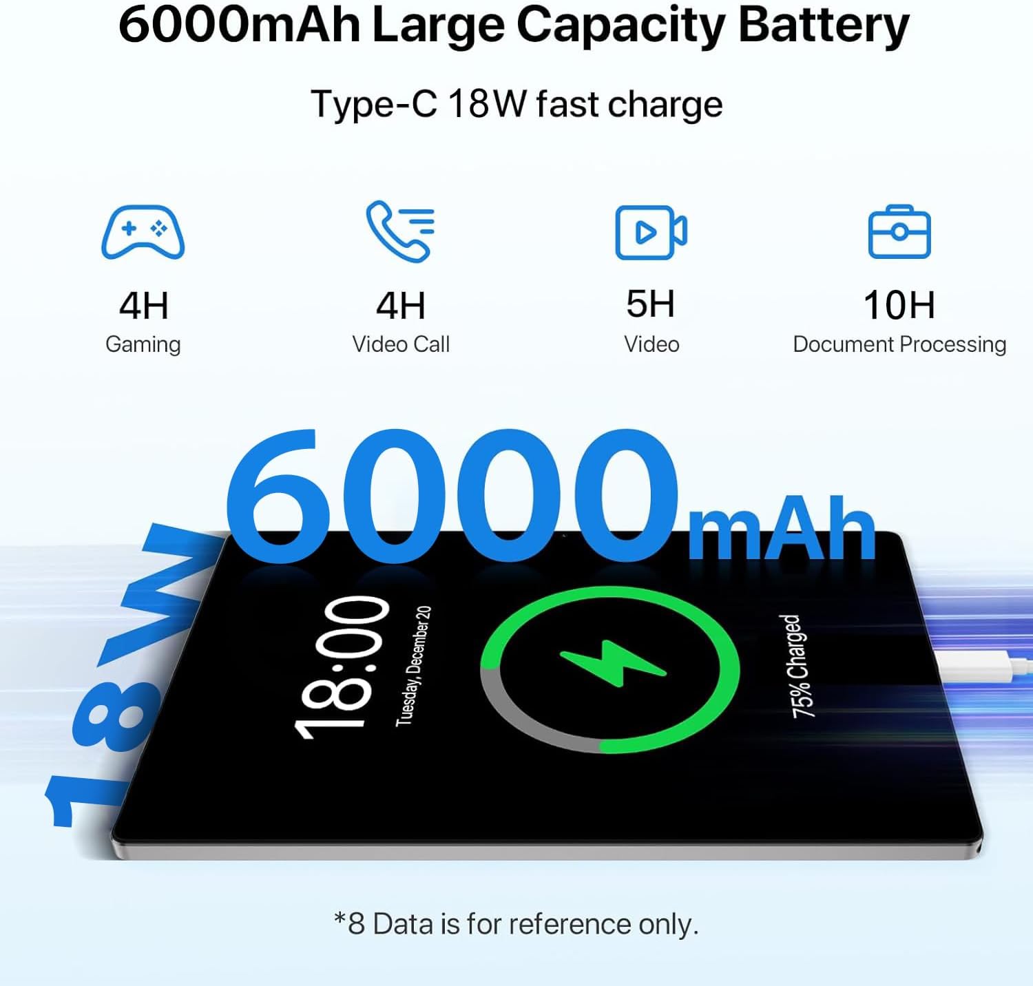 【6000mAh Battery&18W PD】JIMTAB 1009 tablet is an excellent office and gaming tablet, equipped with 6000mAh long-life battery and 18W PD fast charging via Type-C make this android tablet last the whole day for routine task, family entertainment or gaming.