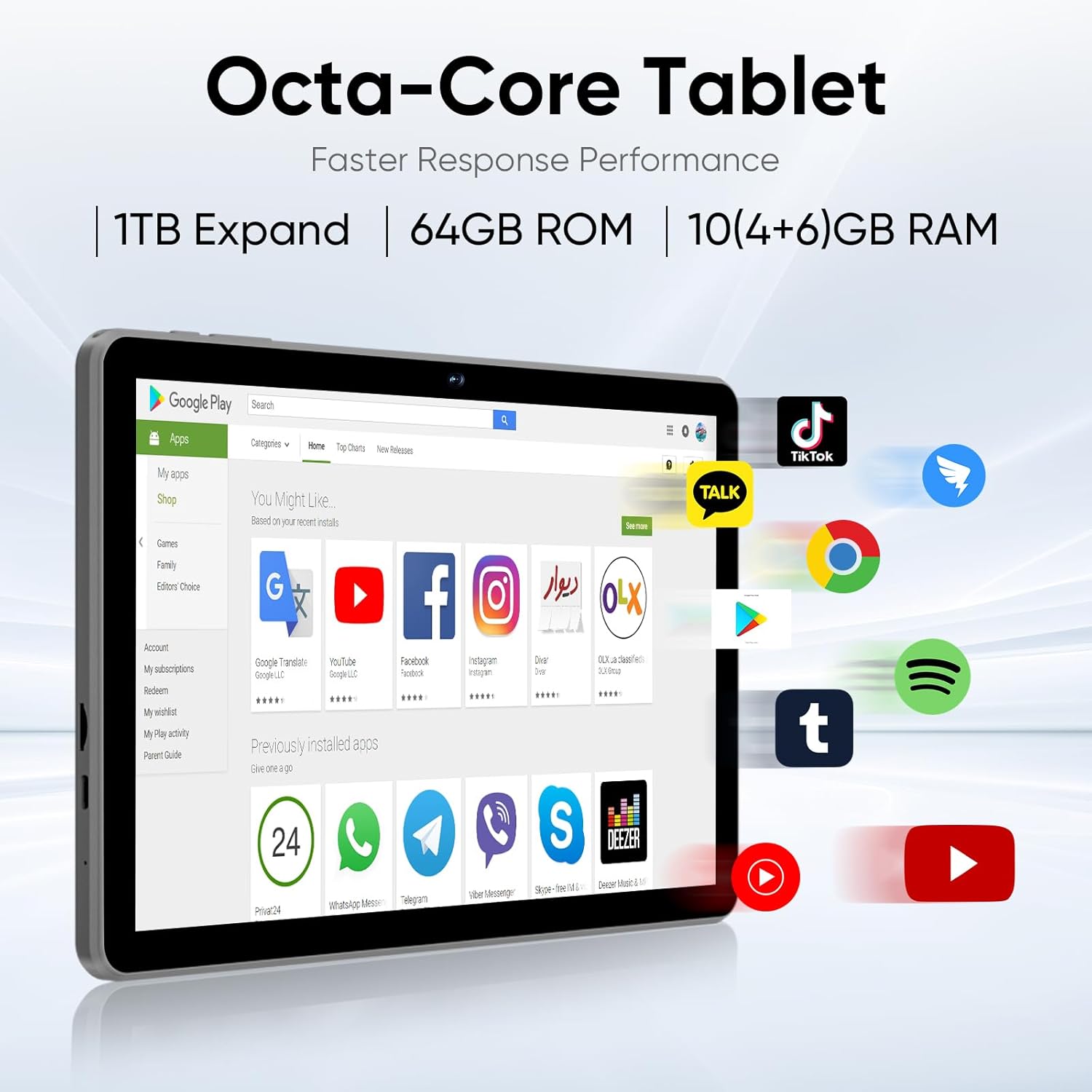 Android 14 Tablet – This 10.1 inch tablet features an octa-core Unisoc T606 CPU and the latest Android 14 OS, with enhanced privacy protection, Improved program speed, and web browsing mobility, providing a faster user experience.