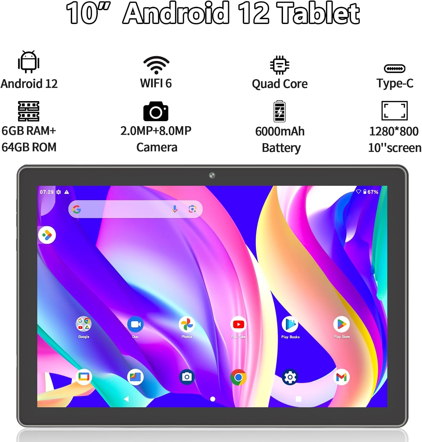 Android Tablet,10 inch Andriod 12 Tablet with 6+64GB ROM, Quad-Core Processor, Google Certified, 1280 * 800 IPS HD Display, Daul Camera, 6000mAh Battery, WiFi 6, Bluetooth (Gray)