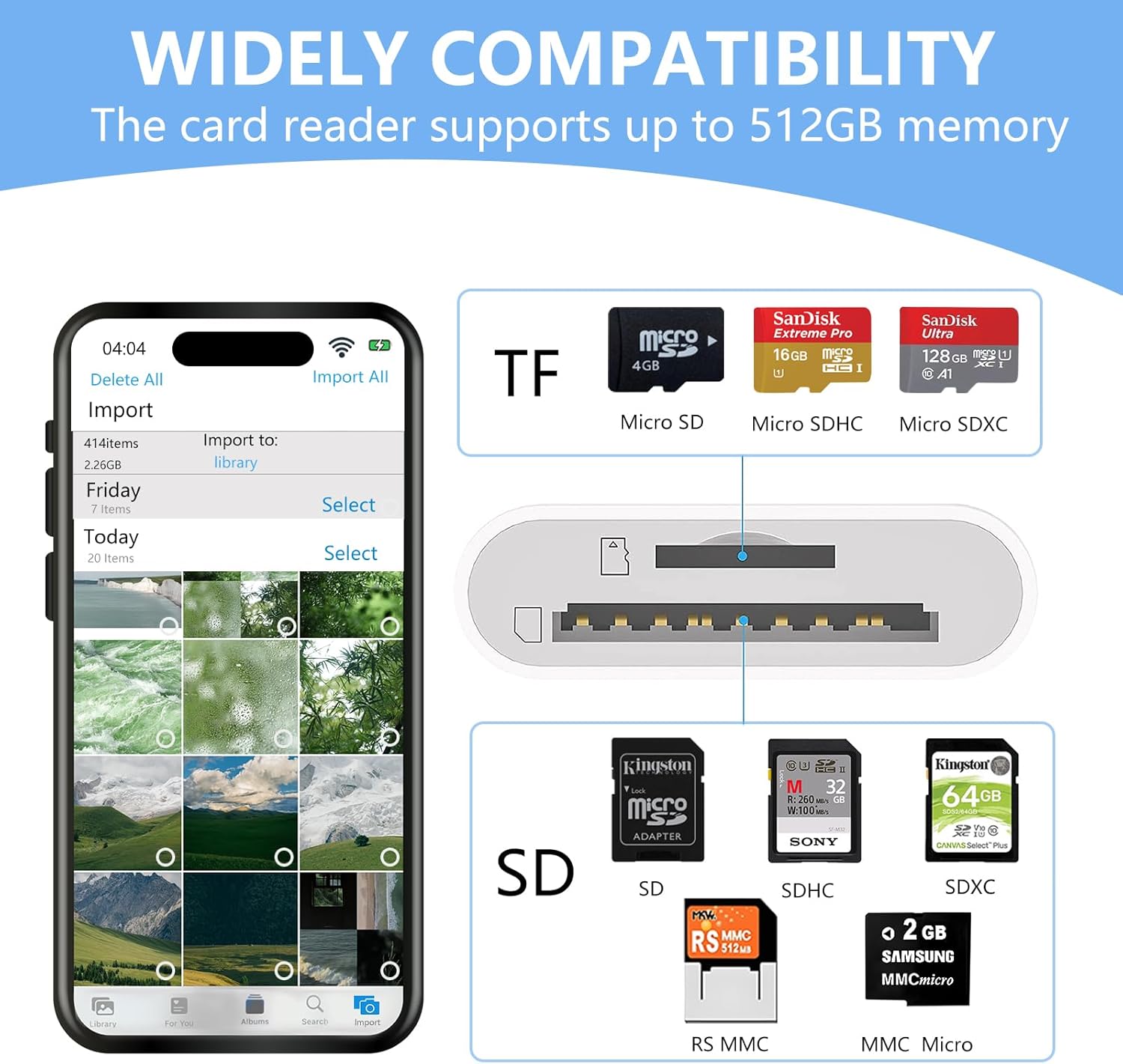 SD, SDHC, SDXC, RS-MMSC;MicroSD, MicroSDHC, Micro SDXC;UHS-I/UHS-II cards from Digital Camera/Dash Cam/Trail Cam.