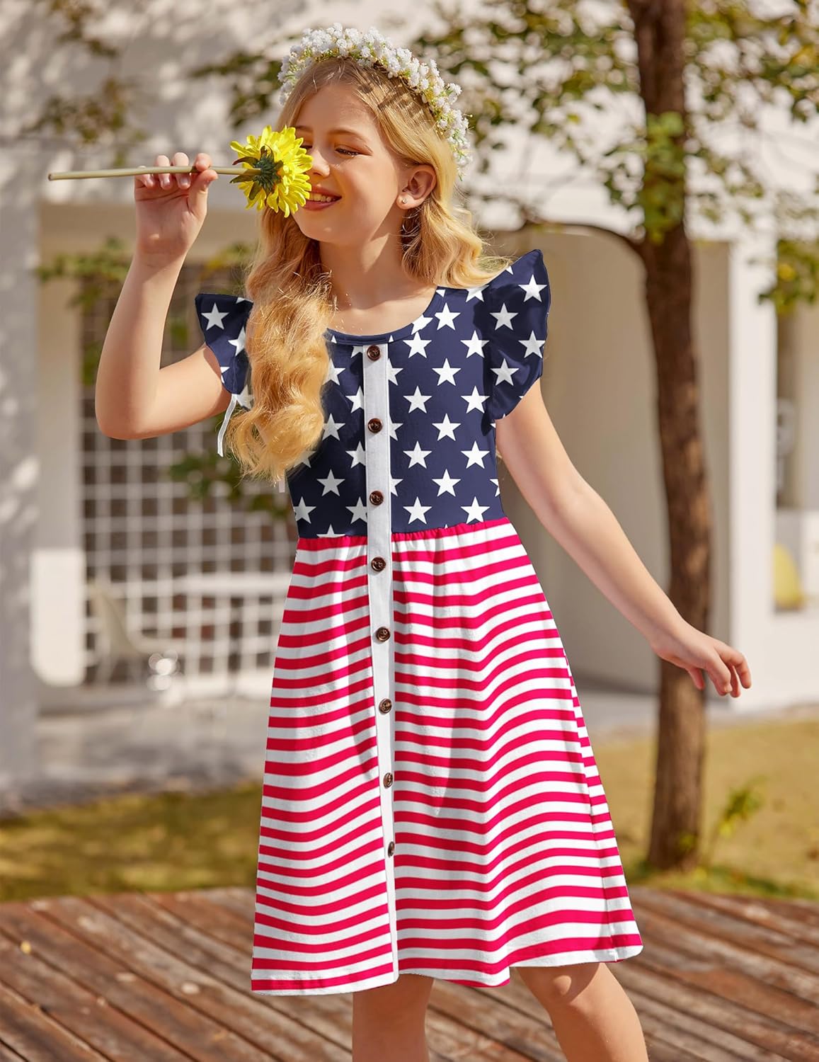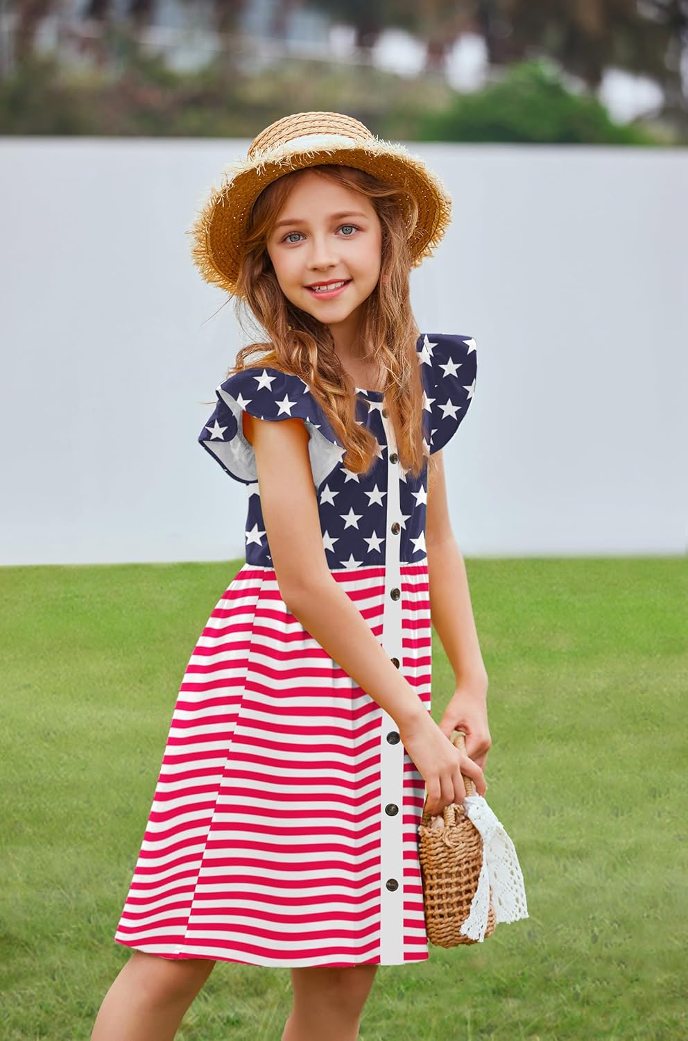 Arshiner Girls Dress Flutter Sleeve A-Line Button Down Sundress Casual Midi Dresses for 4-12 Years Kids