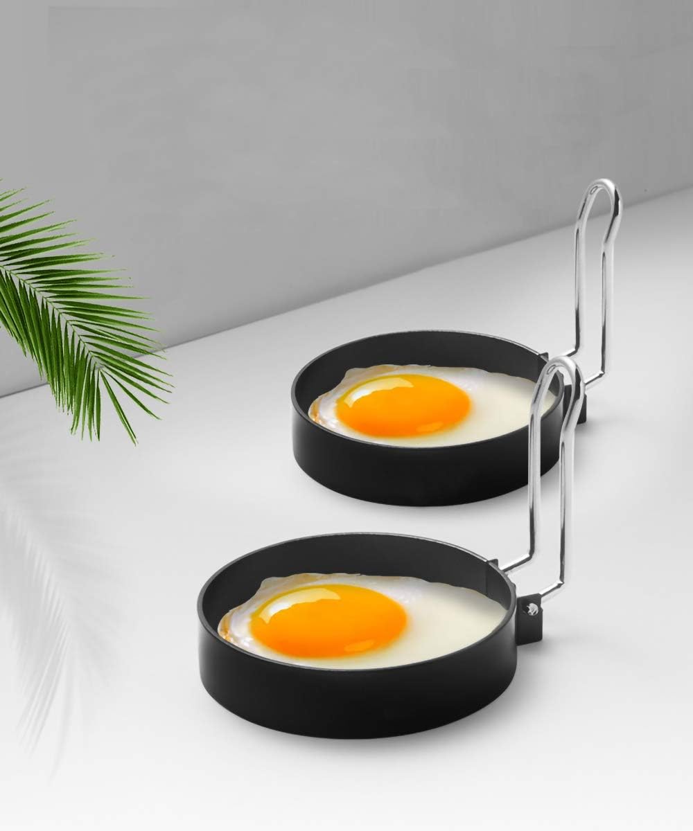 EASY TO USE- Just lift up the foldable handle of the round egg cooker ring, place on your electric griddle or frying pan, then coat with oil and get to fried egg, egg rings for frying eggs.