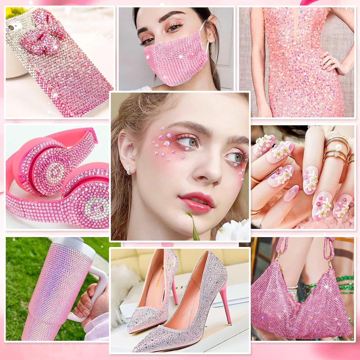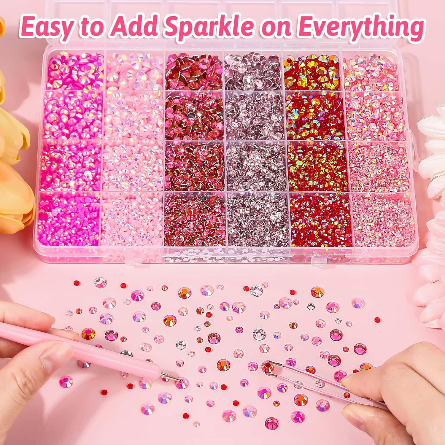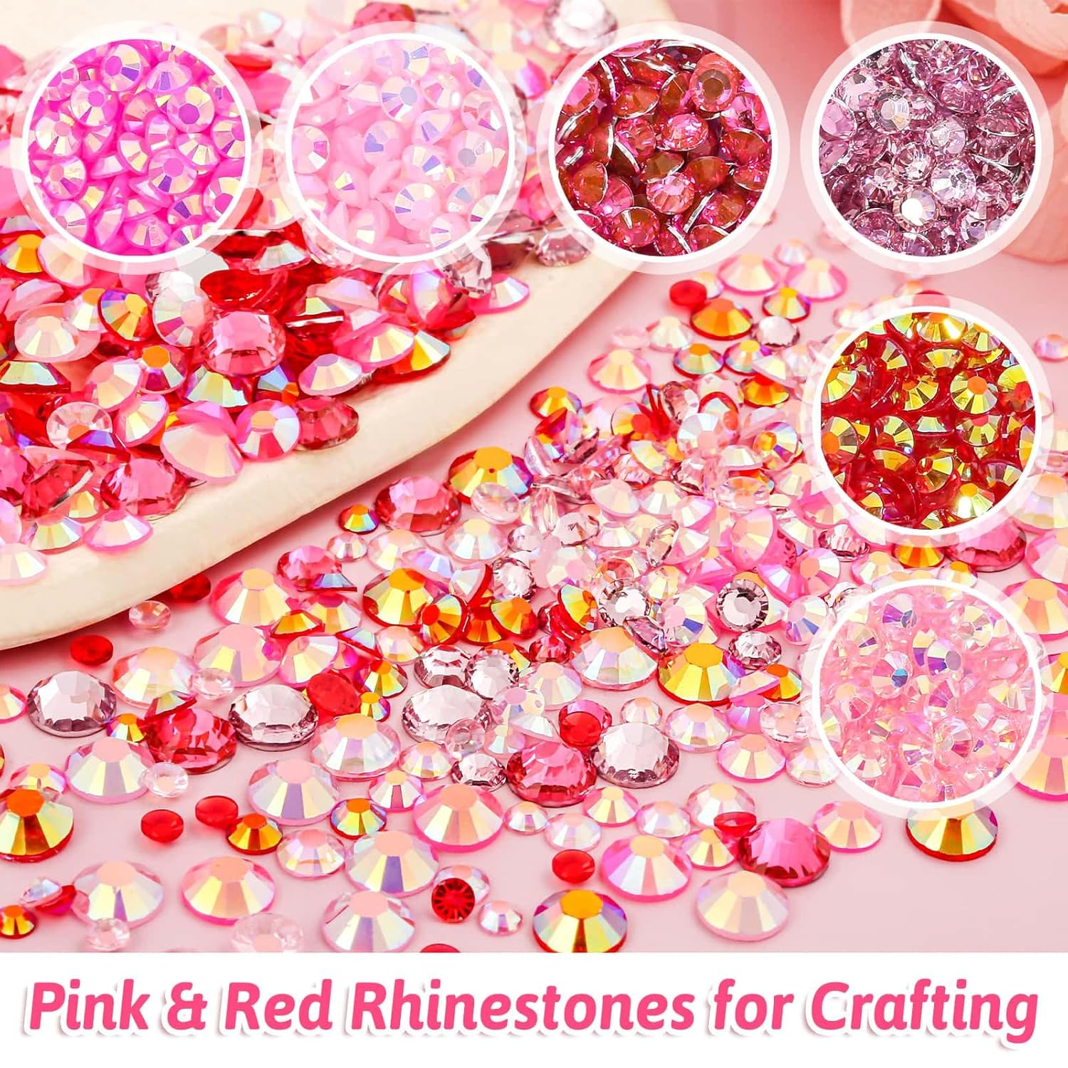【Assorted Colors Rhinestones】 Package includes 18000 pieces of resin rhinestones in 6 different pink and red colors in 3mm, 4mm, 5mm, 6mm, multi-faceted, crystal clear and lightweight, enough rhinestone quantity gives your project with beauty and sparkle effect