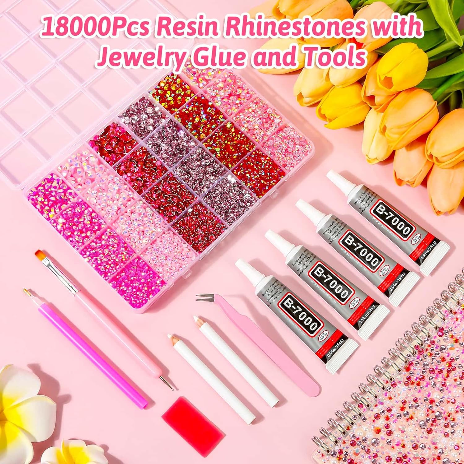 Audab B7000 Glue with 18000Pcs Rhinestones for Crafting, Flat Back Rhinestone Kit Non Hotfix Resin Gems with Clear Jewelry Glue for Clothes Shoes Tumbler Nail Art Makeup Jewelry Making
