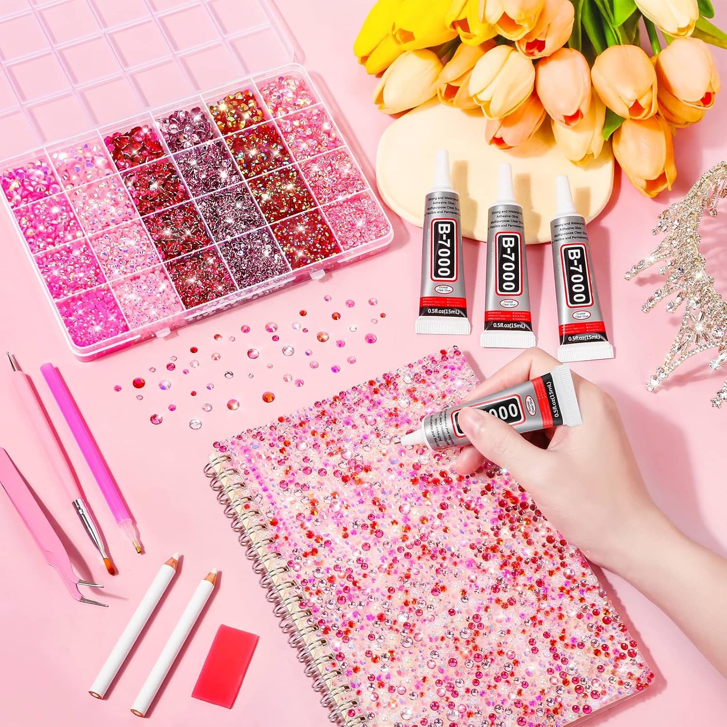 Audab b-7000 glue adhesive with rhinestones kit comes with 4pcs total 45ml B7000 glue for rhinestones, 18000pcs flatback rhinestones beads, 1pcs dotting tools, 1pcs tweezers and 3pcs wax pencil. This multipurpose jewelry glue works on most surfaces, such as fabric, jewelry, metal, cloth, leather, glass, rubber, paper, ceramics, wood, and more. The crystal rhinestones can be used to decorate clothes, shoes, bags, tumblers, toys, cellphone cases, face gems, eye jewels makeup, body art, greeting cards, nail art crafts jewelry making. To give your projects with beauty and sparkle effect.