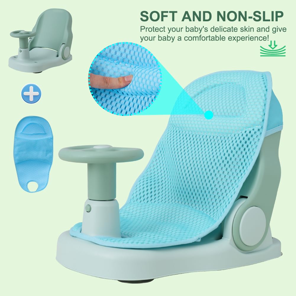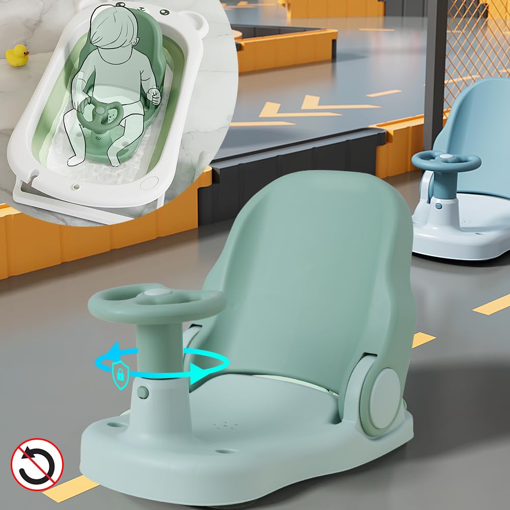 【Premium Material】 joyingbaby non-slip baby bath chair is made of high quality PP, temperature resistance, environmentally friendly and durable. Baby bath seat fun design with steering wheel (note: the steering wheel is fixed and cannot be rotated), convenient for babies to grip, ideal for babies between 6-36 months.