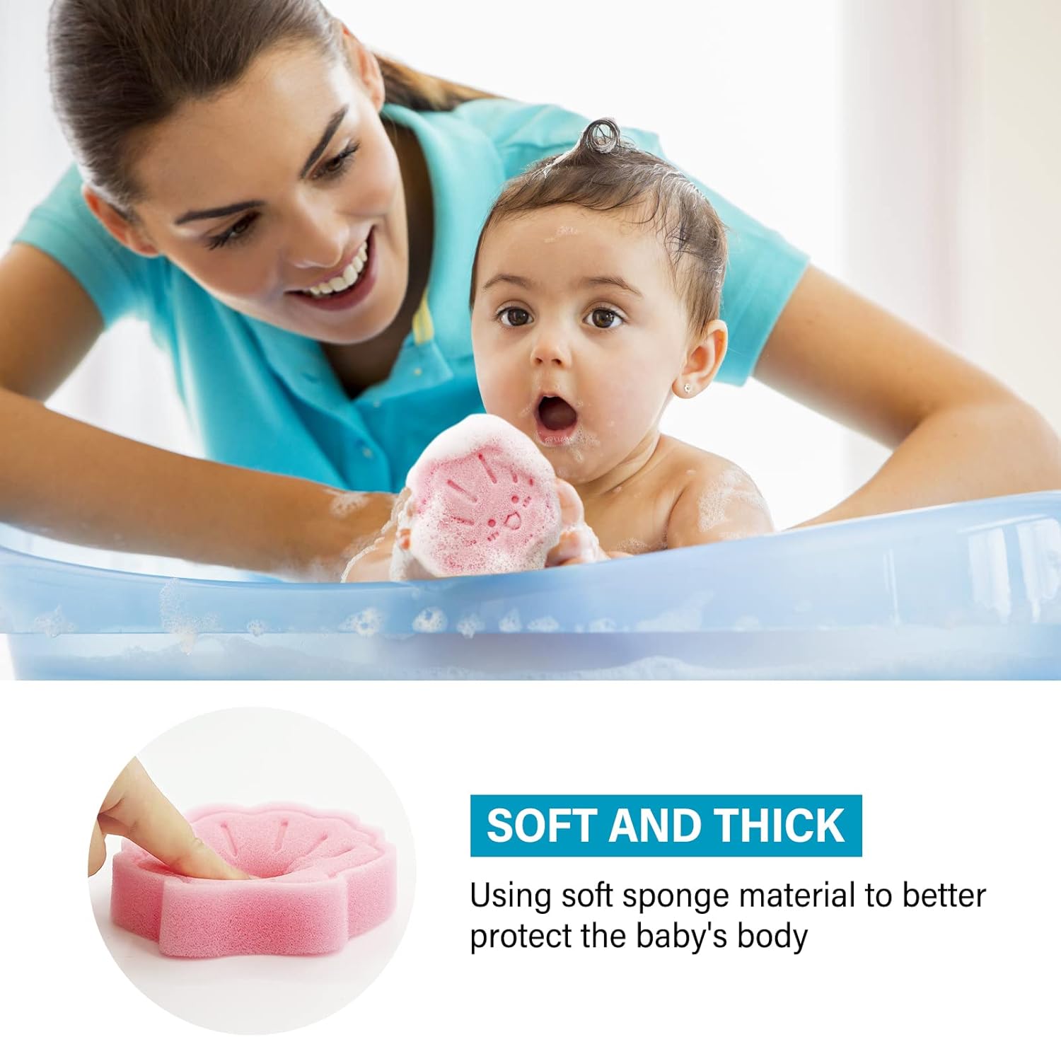 Soft and Safe: Made of soft sponge material to protect baby’s body better; super absorbent and easy to foam, it will let the baby feel very comfortable.