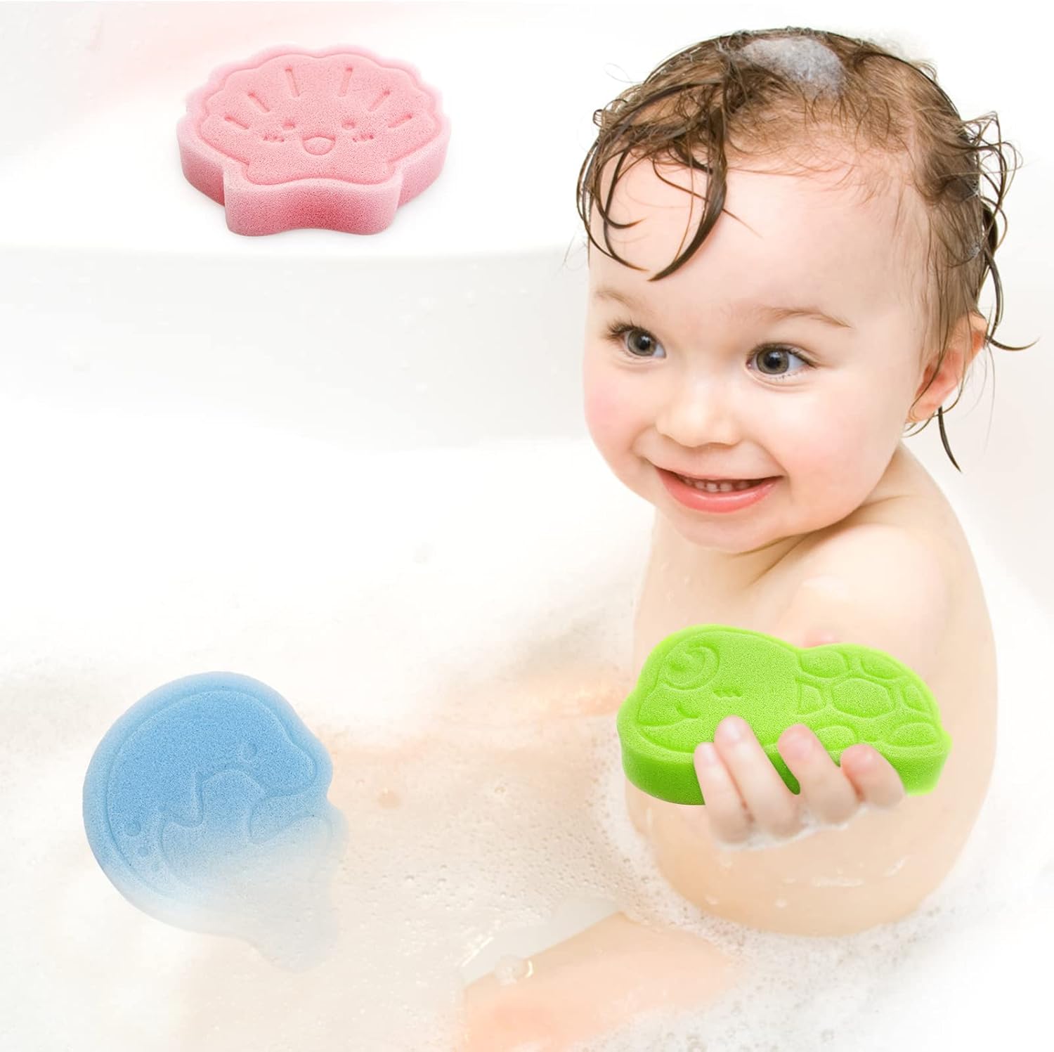 Baby Bath Sponge, Natural Cute Shapes Soft Shower Sponges for Bathing, Bathtub Foam for Infants and Toddler, 3pcs : Blue Dolphin, Pink Shell, Green Turtle