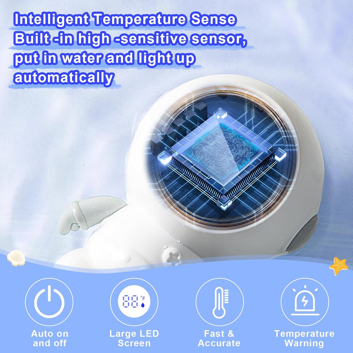 Intelligent Water Thermometer: It takes the LED digital screens, built -in high -sensitive sensors, the real -time temperature is more accurate, automatic switch, touching to light up immediately, automatically turn off after about 5 seconds. Put it in the bathtub water, it will display the temperature within 1 second.