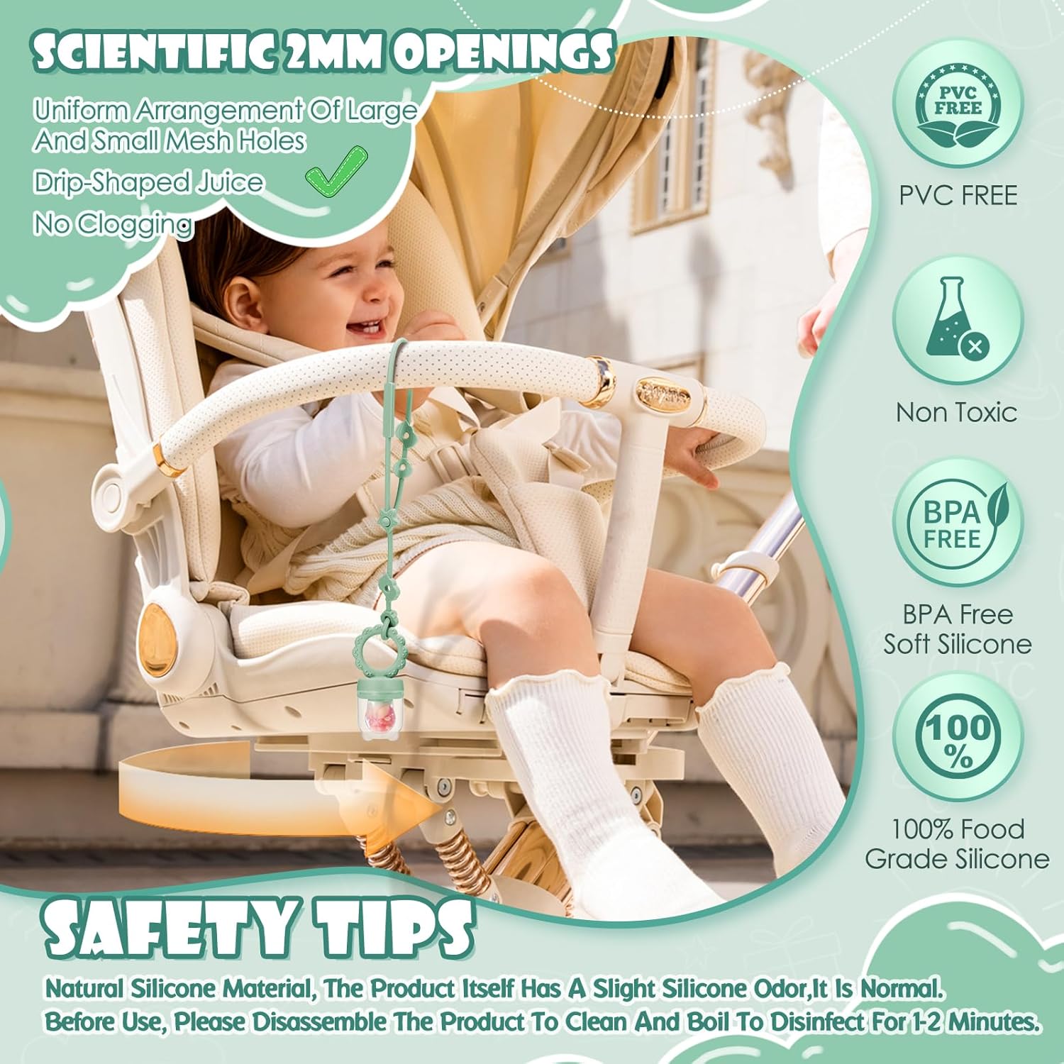 🍓【HIGH QUALITY AND SAFETY BABY FRUIT FEEDER】- This newly developed and designed baby fruit feeder is made of 100% food-grade silicone material,which is safe for babies to chew on.BPA Free, Latex Free, Lead Free and Phthalates Free.soft silicone food pouch with Scientific 2mm hole design,when biting and chewing, the juice will not choke the baby,and will not get stuck in the pulp.easy baby self feeding that only allow small, digestible pieces to pass through,perfect way to introduce solids or new flavours to baby without any risk of choking.