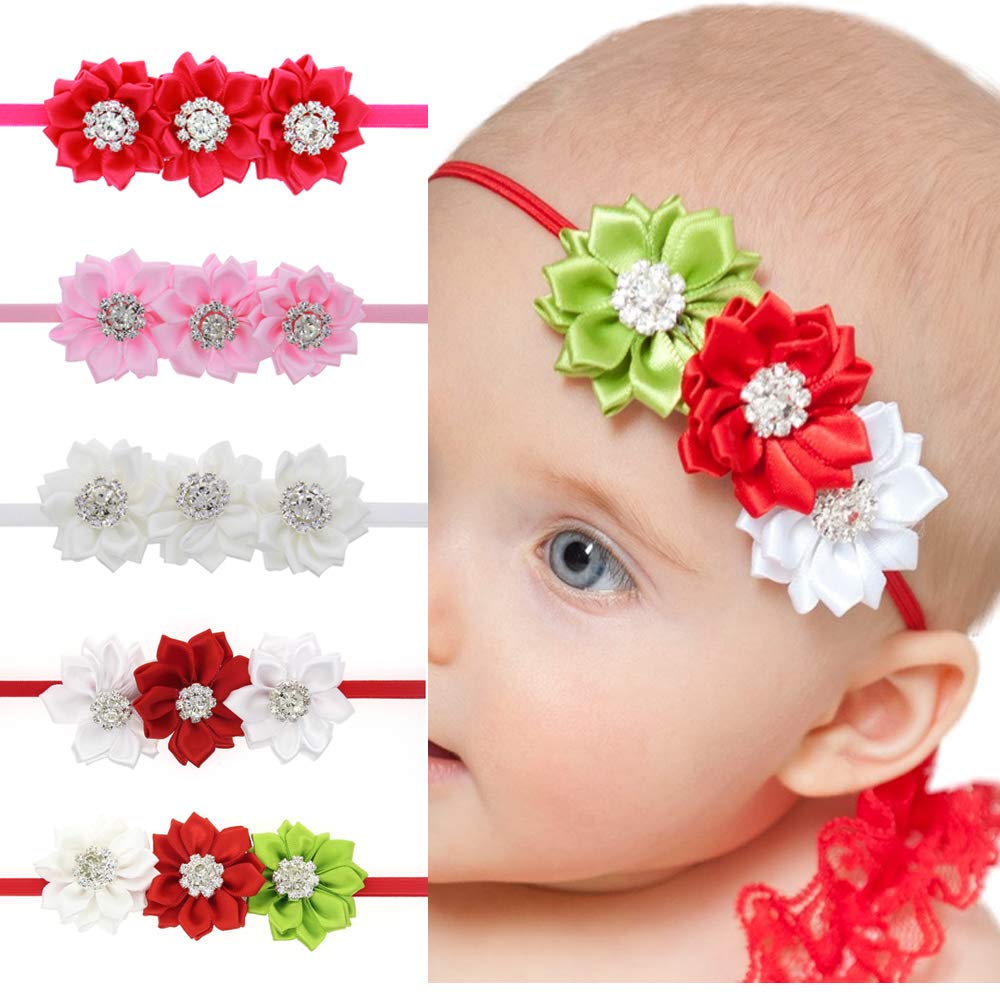 Baby Girl Flower Headband Rhinestone Floral Hairband Hair Accessories for Newborn Infant Toddler Kids (White Red White)