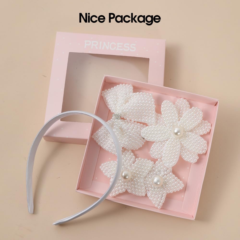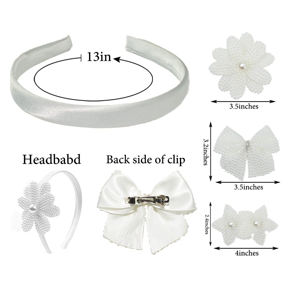 PACKAGE: This hair accessories set for girls comes with 3 pcs white pearl clips and 1 pc satin headband. The clips are in flower, bow, and star designs that can be worn on their own or added to the headband to create a customized girls’ fashion headband look.
