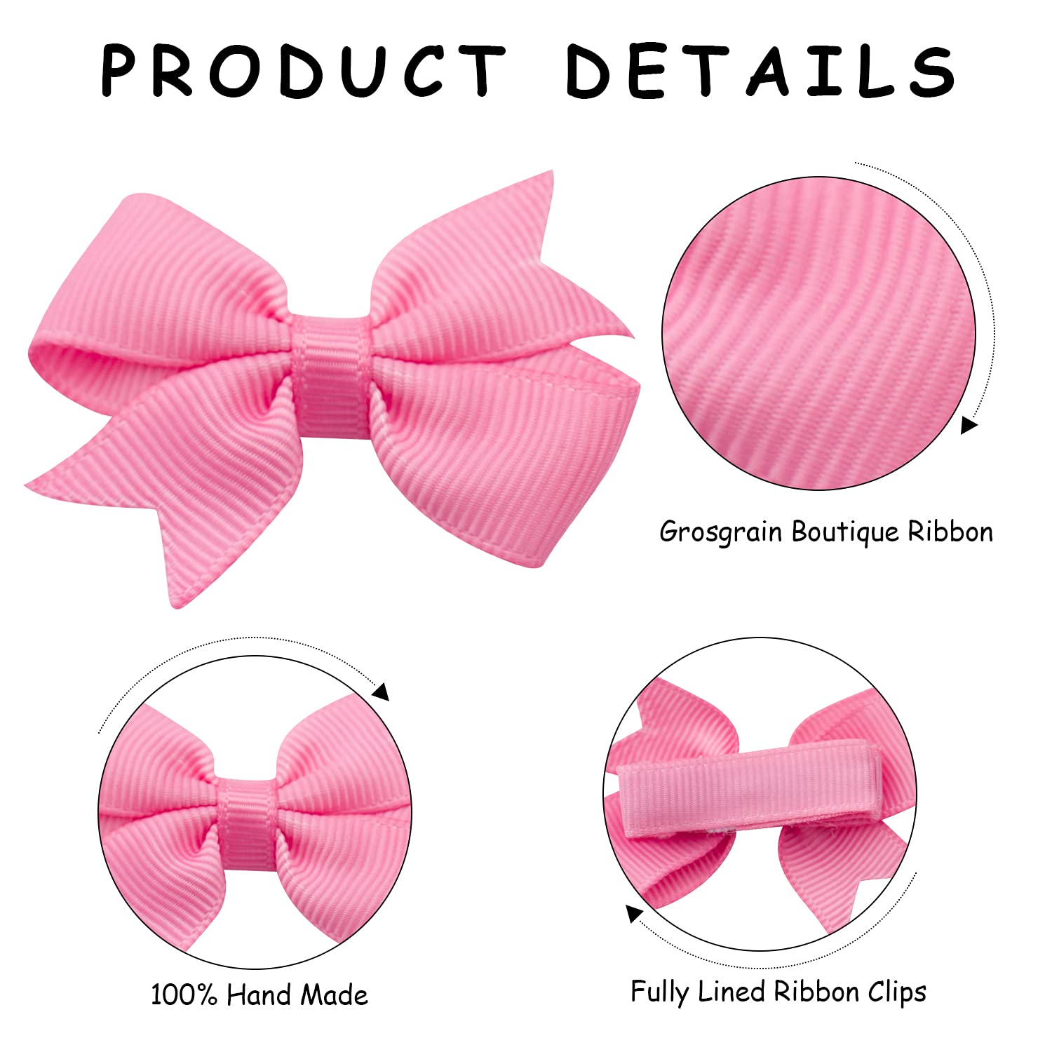 Lots of colors,exactly 20 colors, Each color 2pcs, tiny girl bows clips can do pigtails that is very cute.Baby hair clips covered in fabric so it does not pull hair, but stays perfectly in place. Perfect size for an girls, babies, toddlers, infants, kids and children. Been using them on baby girl toddlers since she was 3 months old.