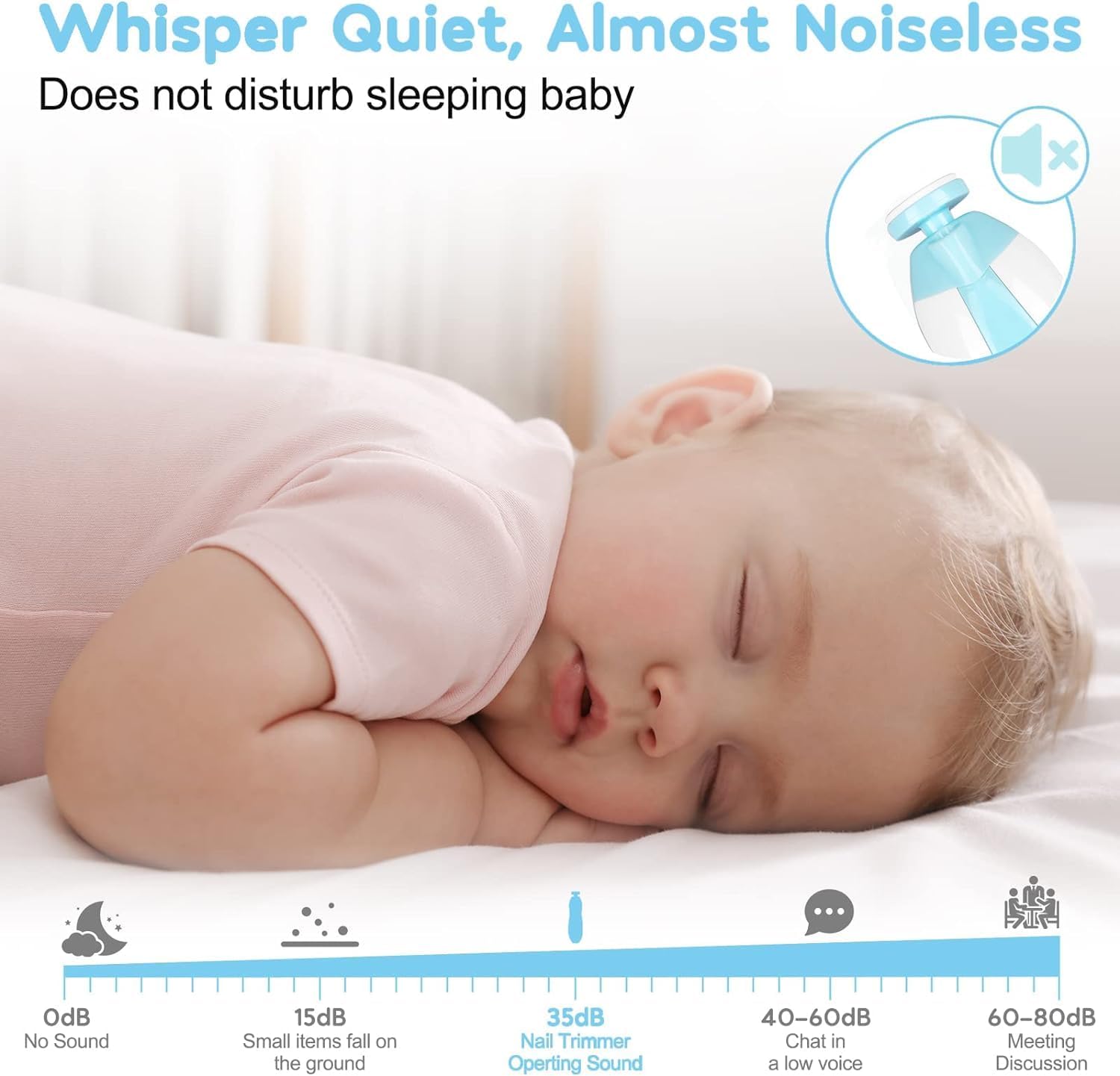 ❤【Noiseless Design】The volume of this baby nail file is only 35 dB. When your baby is sleeping, you can use this nail trimmer to grand your baby’s nail, will not disturb your baby’s sleep, and you can trim and care for your nails in dim and dark environment.