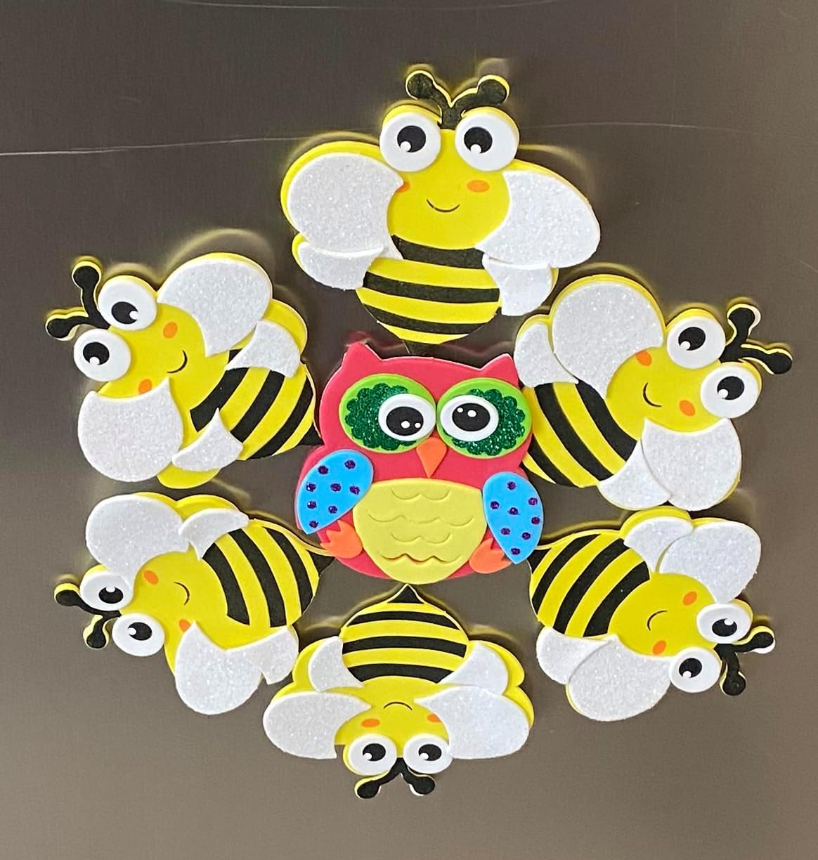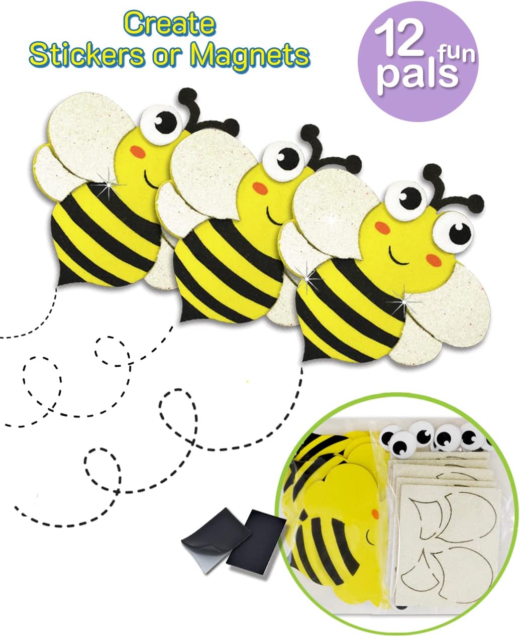 Includes self-adhesive foam pieces and magnets to create 12 complete foam bees – Approximate dimensions per assembled sticker is 3.25″ x 3.5″