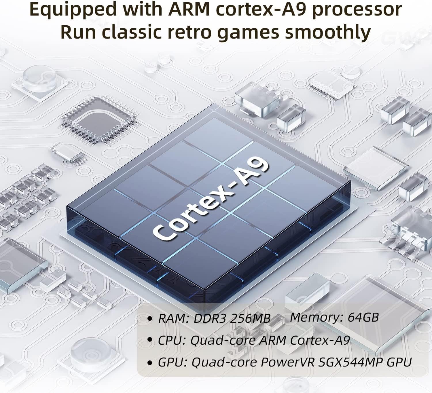 🎮 Powerful Performance: This Retro gaming handheld with Actions ATM7039S quad core processor running up to 1.6GHz. Combined with the quad core PowerVR SGX544MP GPU it supports up to 4th generation gaming consoles and some newer ones.
