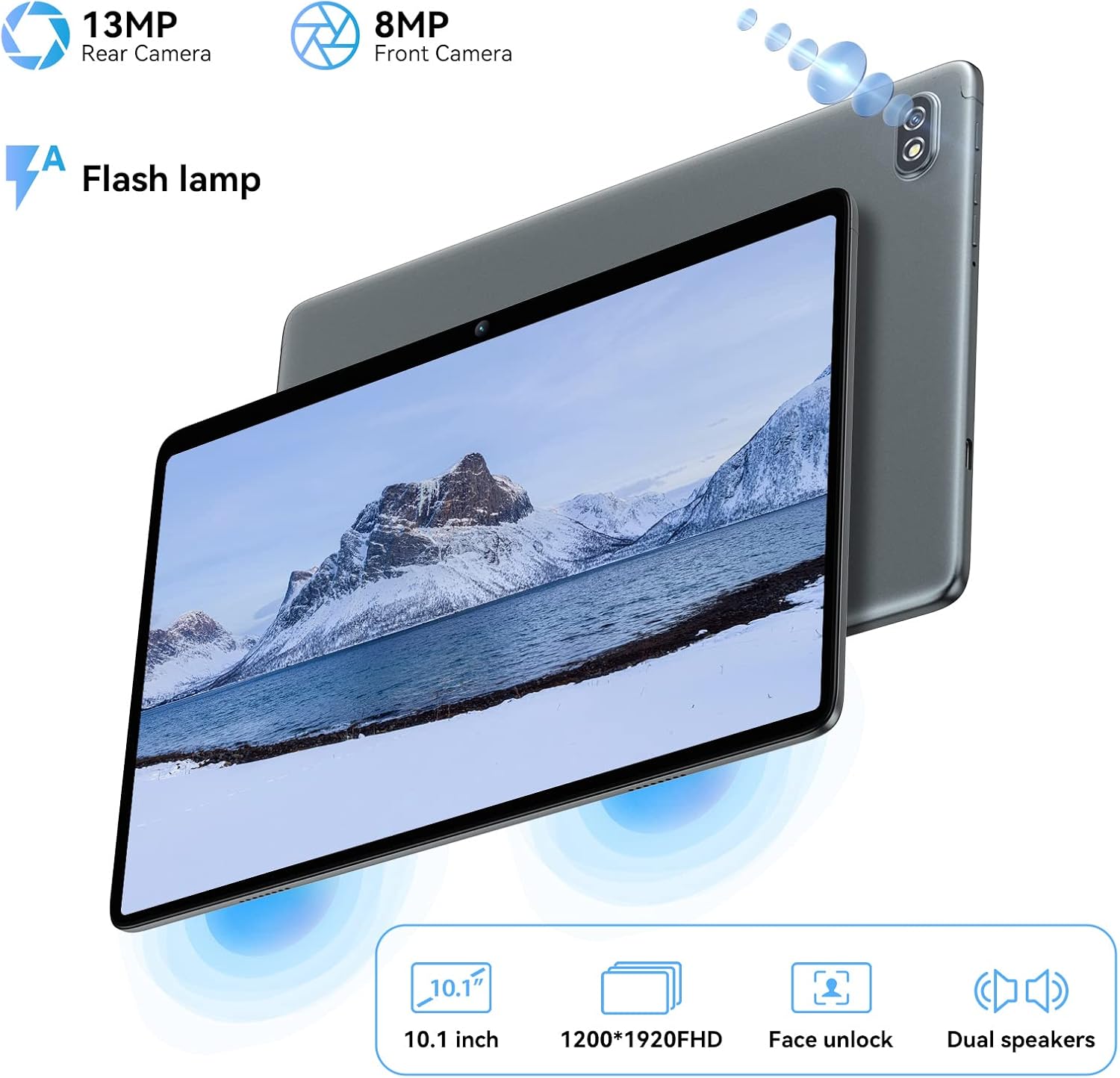 【𝟏𝟑𝑴𝑷+𝟖𝑴𝑷 𝑪𝒂𝒎𝒆𝒓𝒂 + 𝑭𝒂𝒄𝒆 𝑰𝑫 𝑻𝒂𝒃𝒍𝒆𝒕】13MP rear camera is equipped with a flash, which can clearly capture the best moments even in the dark. 8MP front camera, full of personal charm. This 10 inch android tablet can be set to face unlocking, fast recognition, and unlocking only takes 0.1 seconds. Screen cast function, share at any time. Battery manager, apply power saving settings with 6580mAh battery capacity to provide a day of efficient tablet operation.