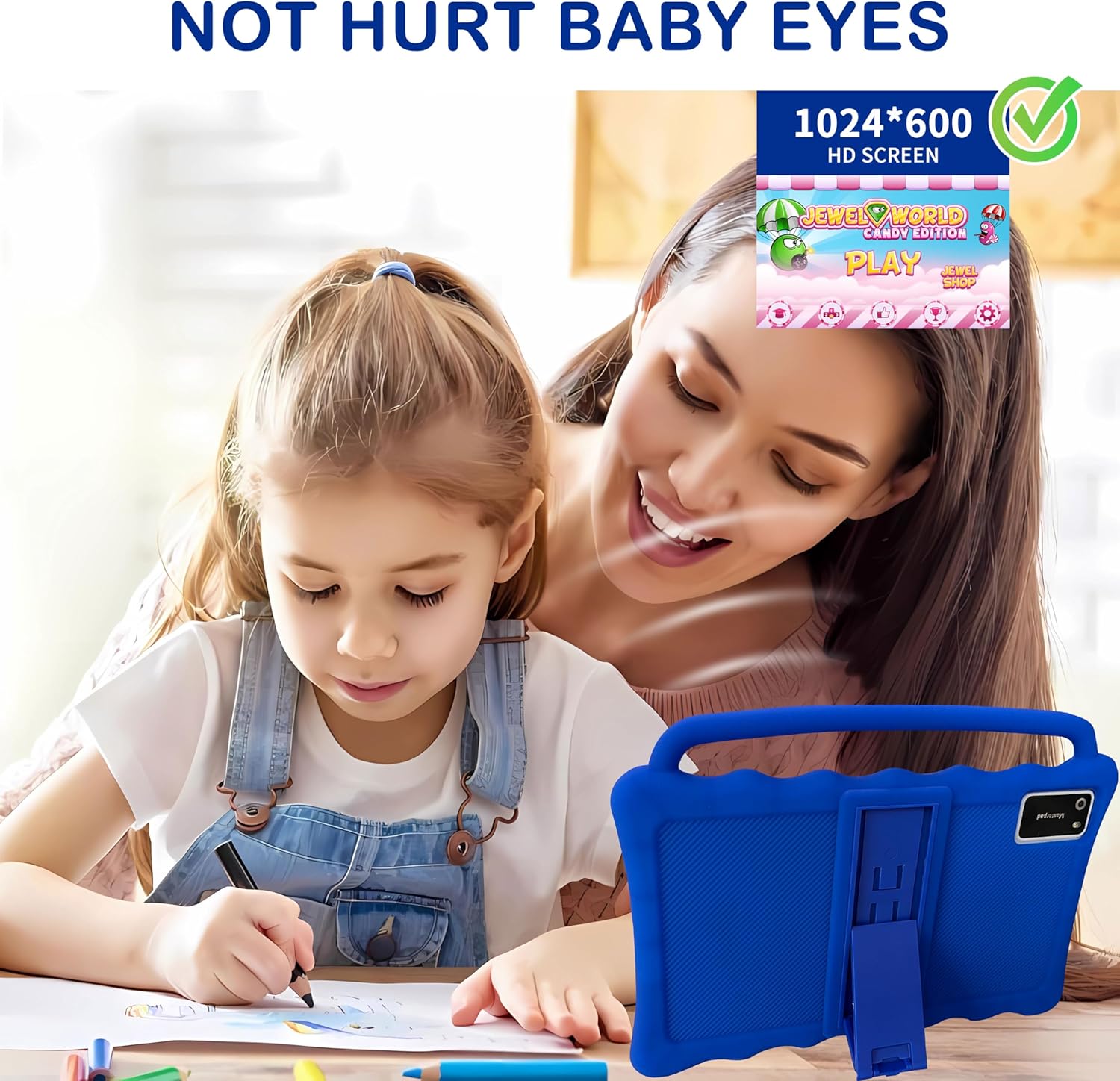 【Eye protection】 The 1024*600 IPS HD touchscreen provides an outstanding visual experience at all angles. The 7-inch LCD screen of the kids’ tablet is designed with low-blue-light technology. The reading mode reduces screen flicker caused by harmful blue light, allowing children to enjoy their activities safely and comfortably.