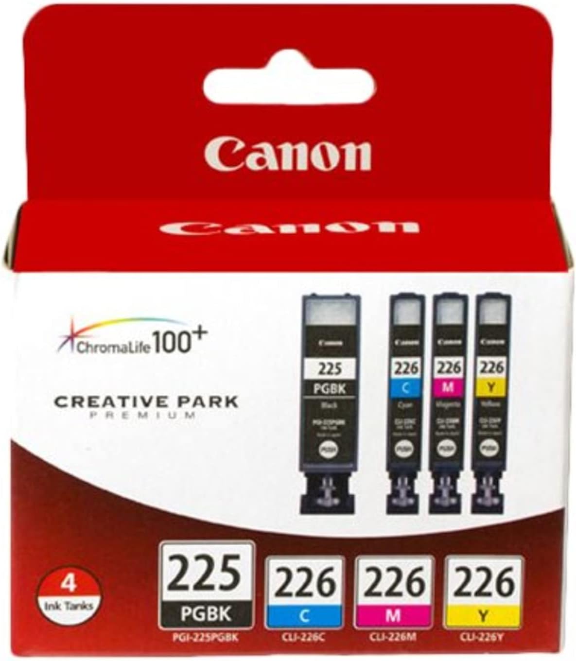 Canon PGI-225 BK/ CLI-226 C,M,Y 4 Pack Value Pack (4530B008) in Retail Packaging.340 Page Yield @ 5% coverage for Pigment Black, 510 Page Yield @ 5% coverage for C/M/Y.