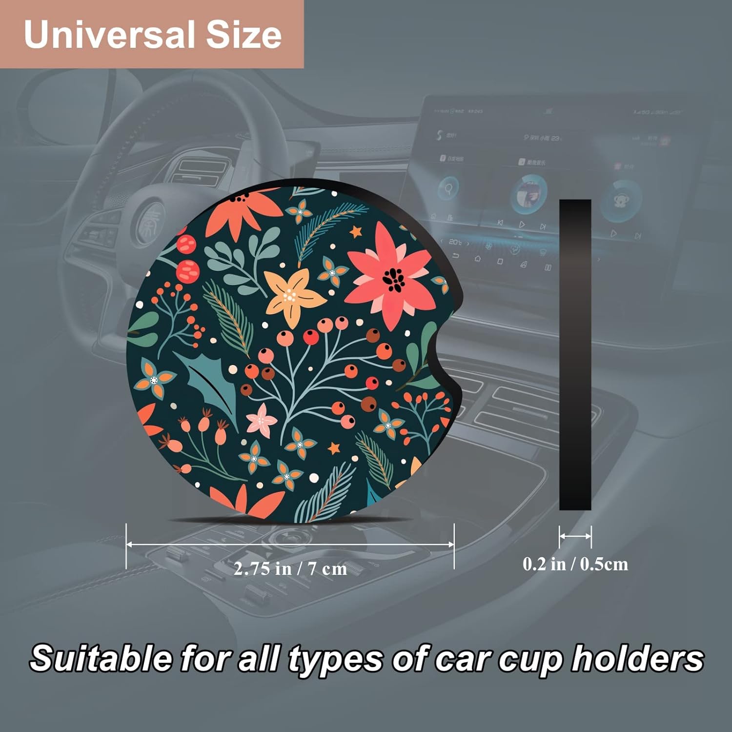 2.75 inches diameter car cup holder coaster fits almost all of cars. Also it can be widely used at home and office. Tips: Please measure your car cup holder’s diameter before buying.
