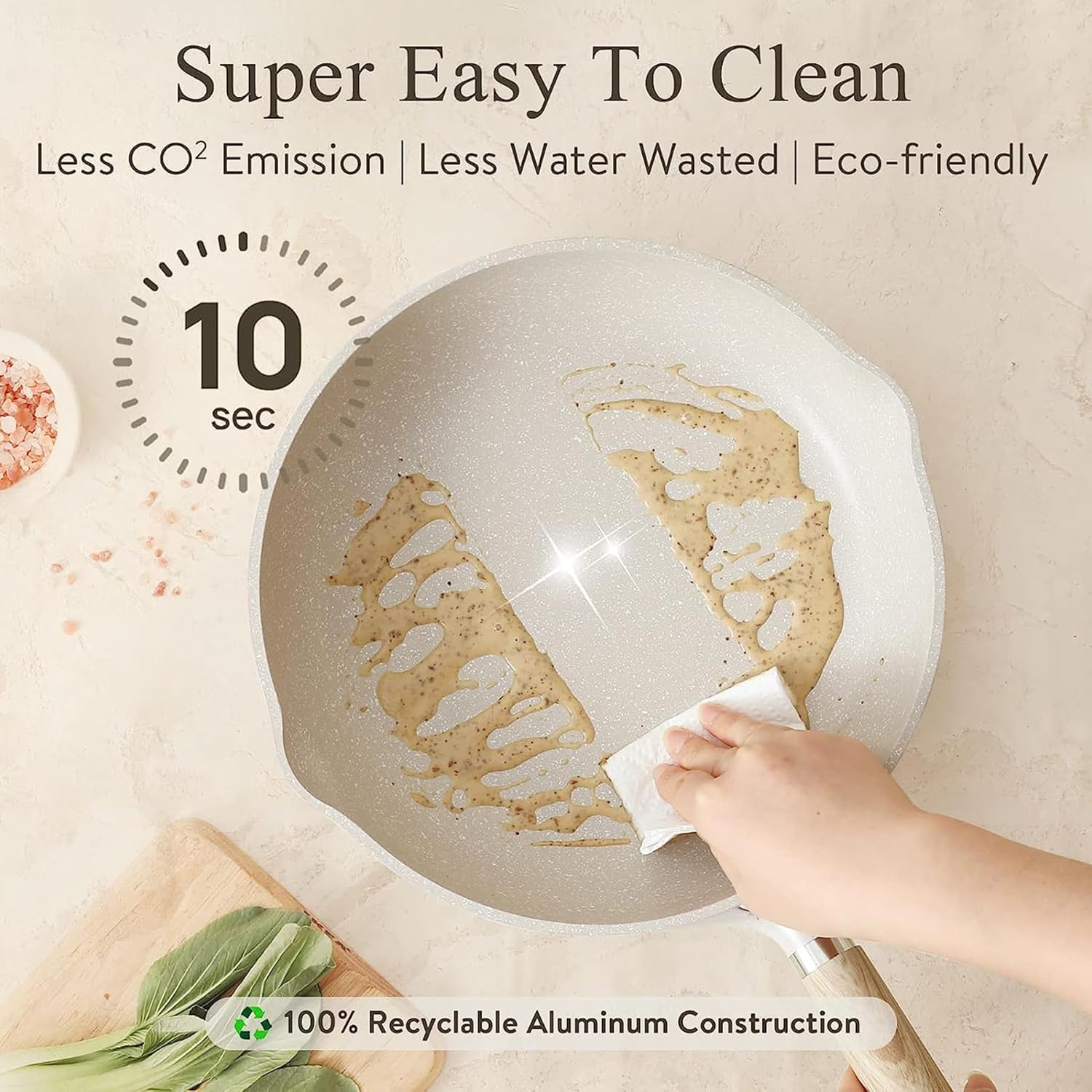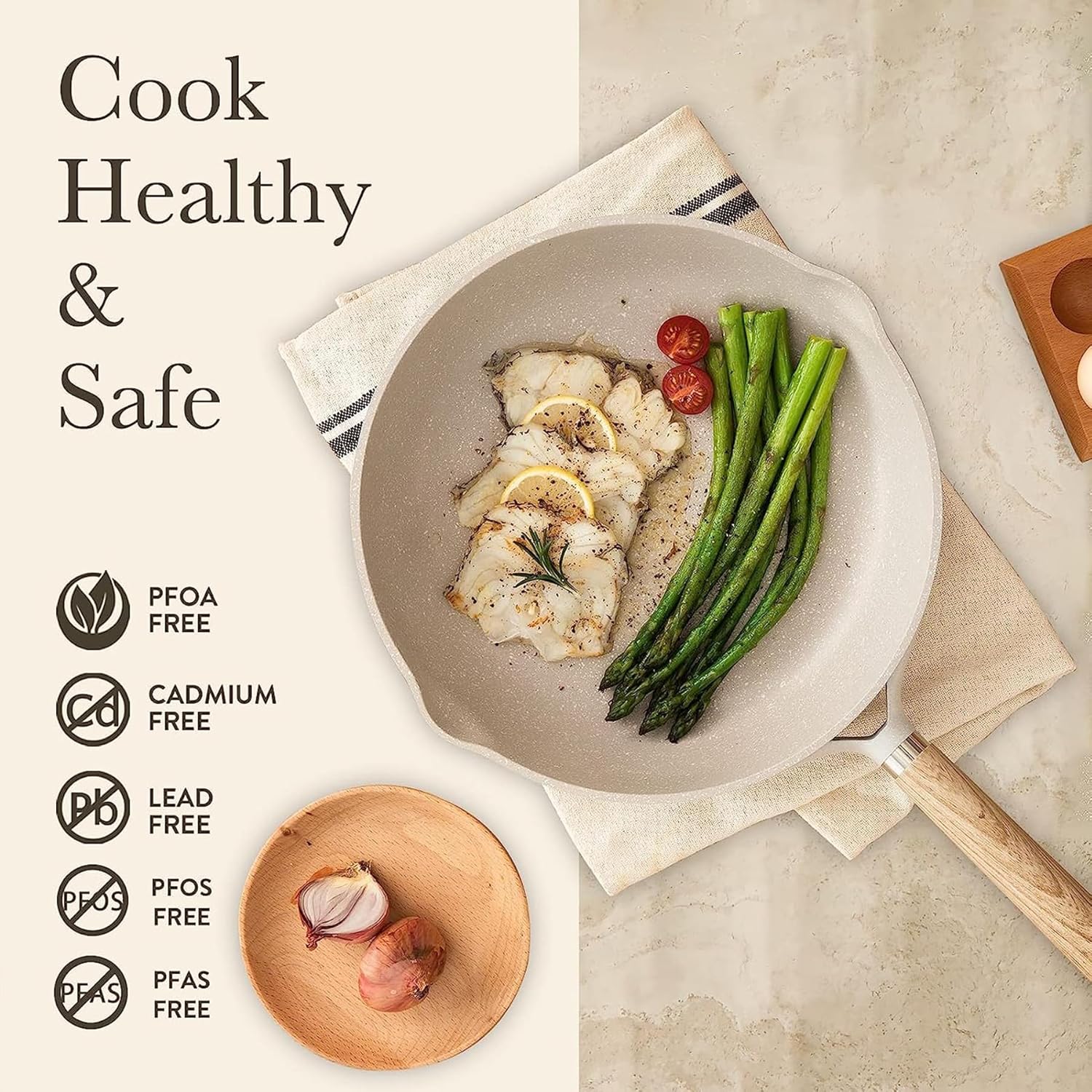 【Natural elements】- Granite coating combined with wood grain handle. We are committed to using these elements to restore the simplest of cooking styles and the most authentic flavors of food. Tip: Faux wood handles are not suitable for use in ovens.