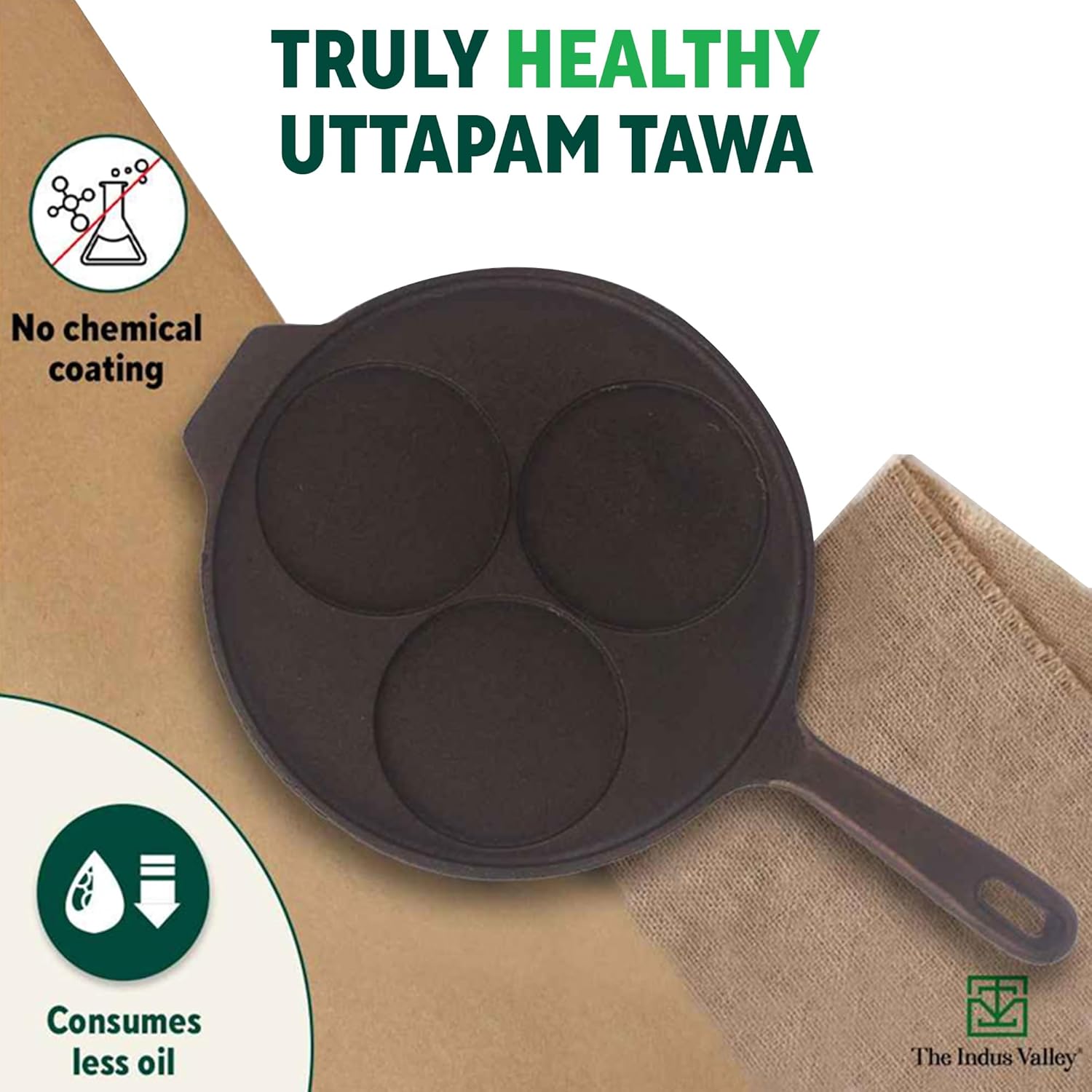 Cast Iron Uttapam Tawa/Tava | 9 Inch, 1.6kg, 3 Pit, Gas & Induction-Friendly| Pre-Seasoned, 100% Toxin-Free, Naturally Non-Stick, Long Lasting