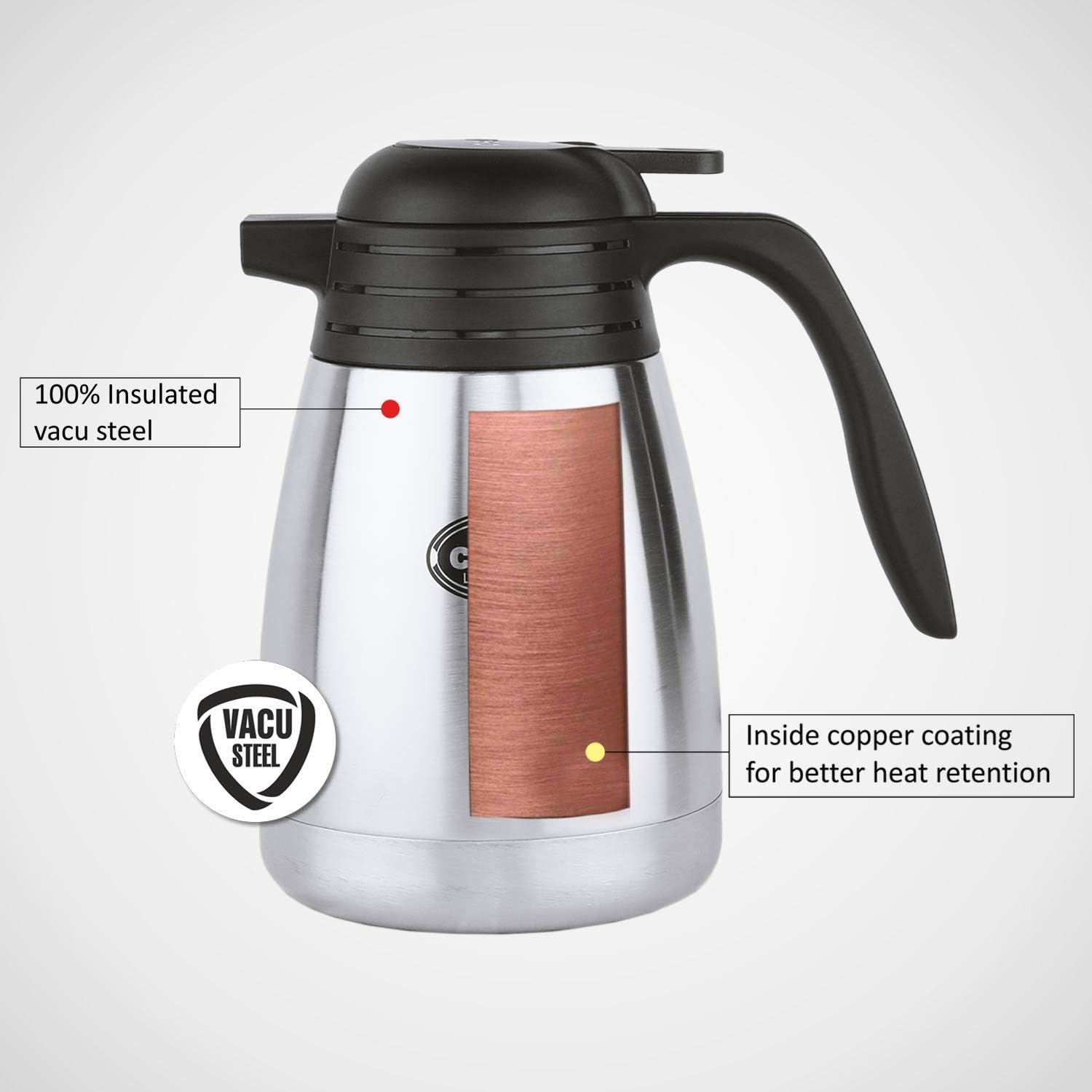Inside copper coating for superior heat retention 100% insulated stainless steel body