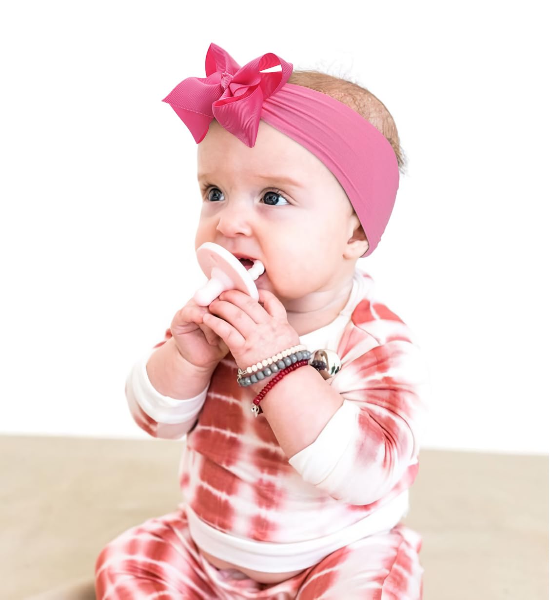 Softest Nylon Material: Nylon Headbands with bow (70% Nylon,30% spandex).Super soft.Great elasticity and resilience.They will consummate fit for preemies,newborns,and also can hand stretchy to perfect fit for infants,toddlers,schoolgirls,even adults.