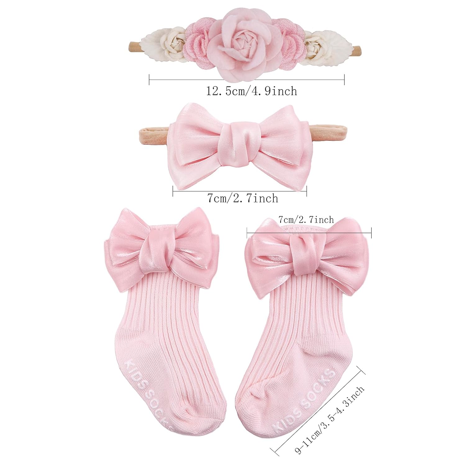PACKAGE INCLUDES – You will get 2 pieces of baby nylon headbands bows and a pair of knitted socks (Typical Age 0-2 Years). All items have adorable flower themes that your infant is sure to love.