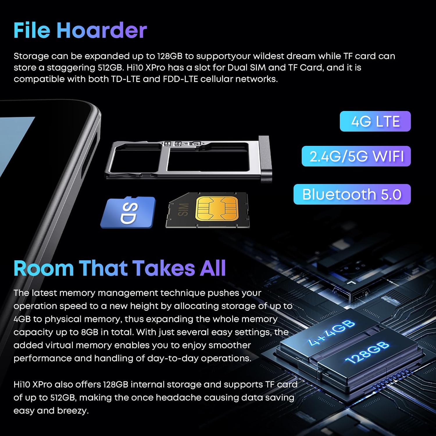 Hi10 XPro Android 13 Tablet has a slot for Dual SIM and TF Card, and it is compatible with both TD-LTE and FDD-LTE cellular networks.