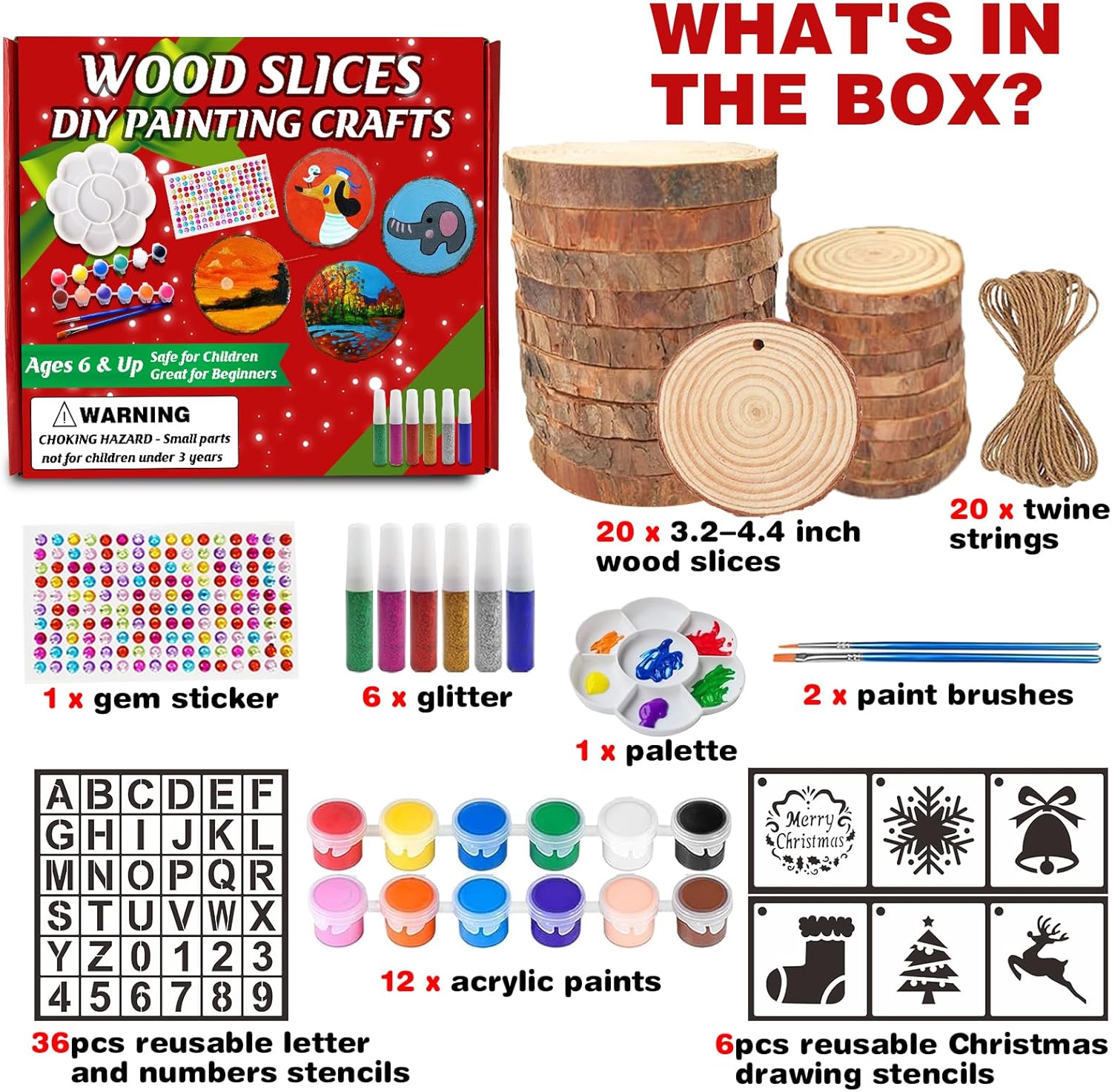 Wood Slices for Crafts: This is a very rich wooden painting kits that includes 20pcs of natural wood slices 3.2-4.4 inch in diameter and 0.4 inches thick, 20 twine strings, 2 paint brushes, 12 acrylic paint, 6 glitter, 1 palette, 1 gem sticker, 3inch 6pcs reusable christmas stencils (snowflakes, Christmas tree, Santa Claus, deer, Christmas stocking, Merry Christmas ), 2.5inch 36pcs reusable Letter and Numbers Stencils.