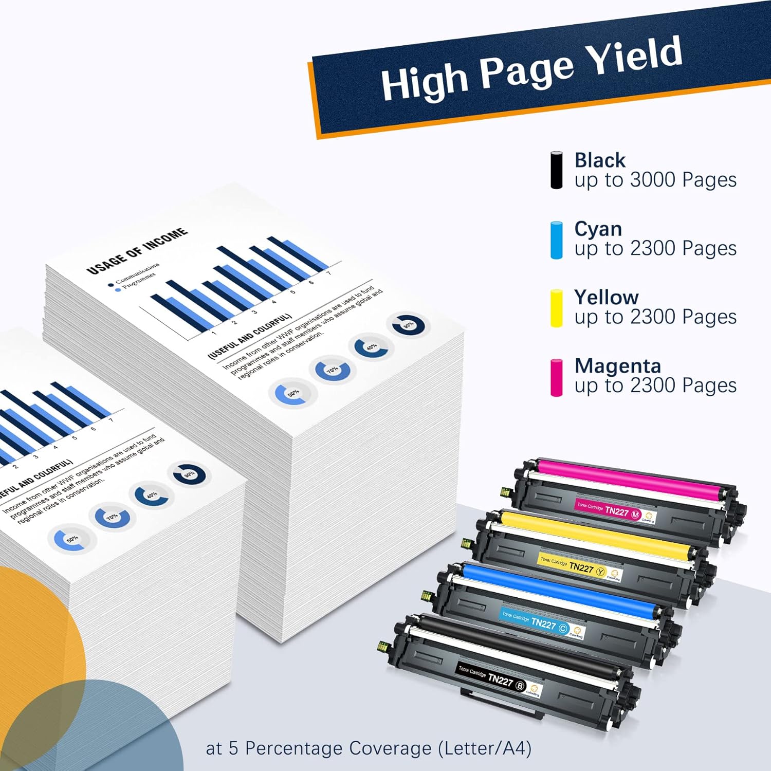 High Page Yield: Compatible TN227 TN227-BK TN227BK TN-227BK is 3000 Pages Per Black Toner Cartridge, Compatible TN227C, TN227M, TN227Y, TN-227C/M/Y is 2300 Pages Per Color Toner Cartridge at 5 Percent Coverage of A4 Paper