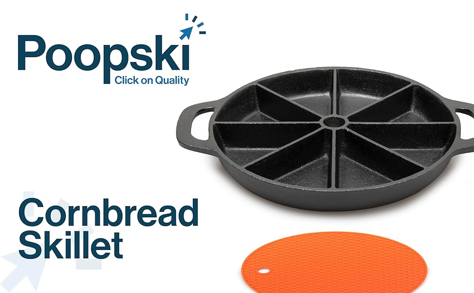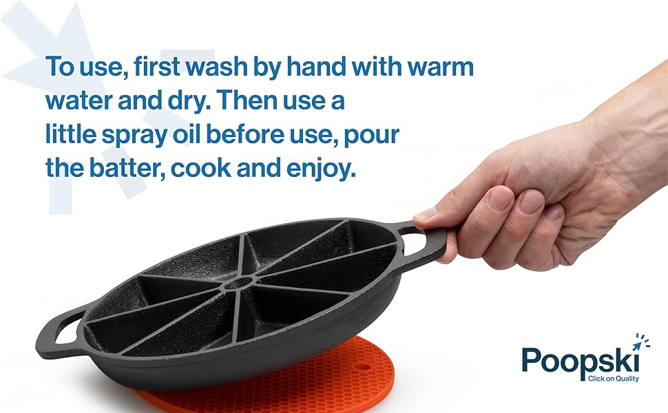 Your pre-seasoned cast-iron Poopski cornbread pan can bake 8 wedge biscuits, corn bread or 8 pieces of scones.