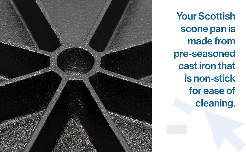 Your divided Scottish scone pan is made from pre-seasoned cast iron that is non-stick for ease of cleaning.