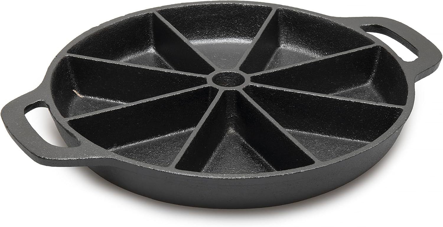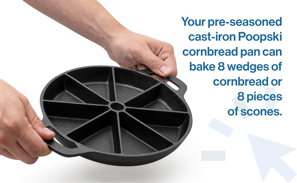 Your pre-seasoned cast-iron Poopski cornbread pan can bake 8 wedge biscuits, corn bread or 8 pieces of scones.