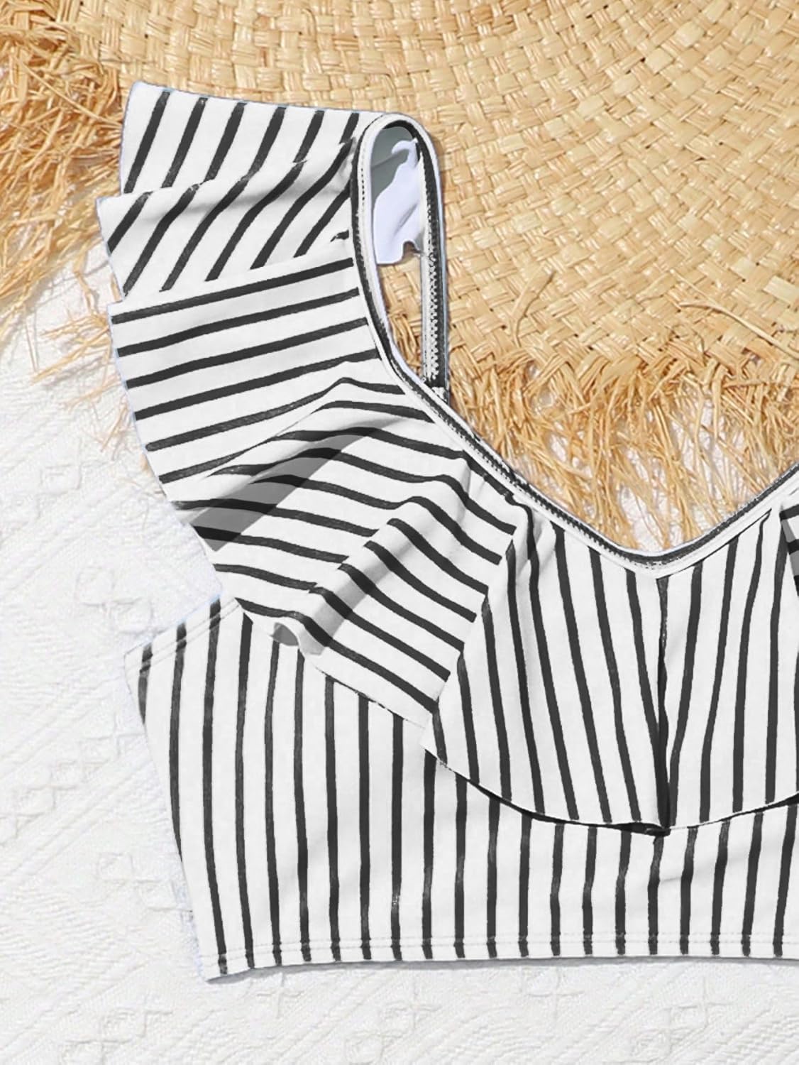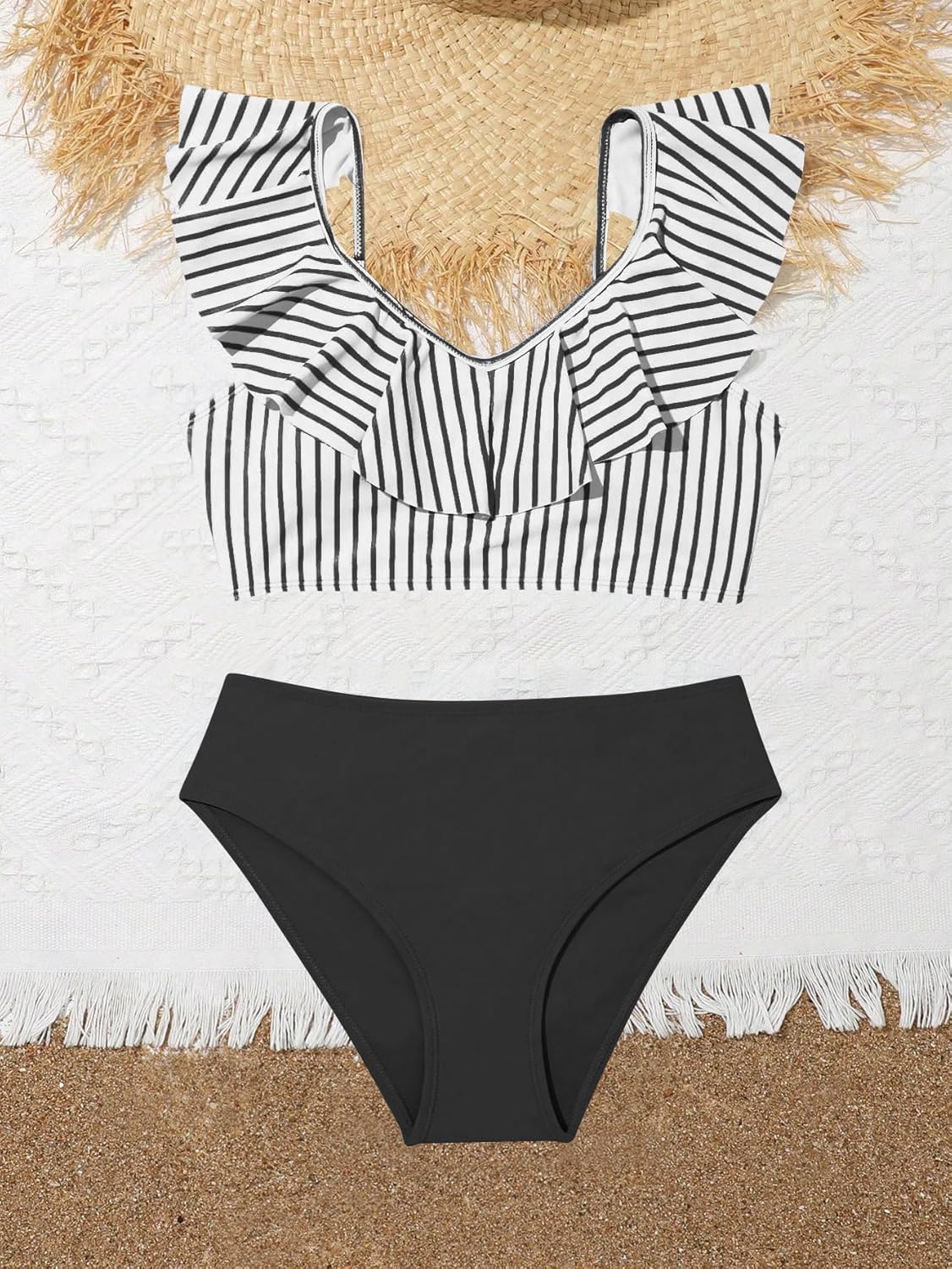 COZYEASE Girl’s 2 Piece Swimsuits Striped Print V Neck Ruffle Hem High Waisted Bathing Suit Cute Bikini Set